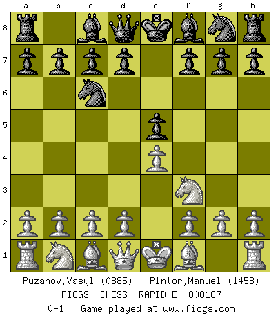 Last move : 0-1 2017 July 26 0:40:2 [Event "FICGS__CHESS__RAPID_E__000187"] [Site "FICGS"] [Date "2017.06.22"] [Round "1"] [White "Puzanov,Vasyl"] [Black "Pintor,Manuel"] [Result "0-1"] [WhiteElo "0885"] [BlackElo "1458"] 1.e4 e5 2.Nf3 Nc6 0-1 This chess game has been lost on time (started : 2017.06.22 20:2:41) King's pawn game Player Black won this chess game. Follow this game move after move (download)A chess genius has died; a loss for humanity. (Viktor Kortchnoi, about Bobby Fischer's death) Meine Liebe ist Schach, Schach, Schach. Ich muss jeden Tag Schach spielen, deshalb fühle ich mich so stark. (Miguel Najdorf) Sin errores no puede haber brillantez. (Emanuel Lasker) Pour se monter efficace, un Cavalier a besoin d'avant-postes ! Les Cavaliers font les meilleurs bloqueurs de pions passés. Employ the attack like tactic of defense. (Chinese proverb)