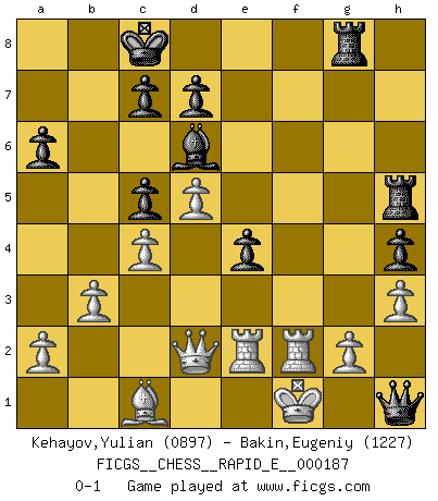 Last move : 0-1 2017 August 19 5:23:43 [Event "FICGS__CHESS__RAPID_E__000187"] [Site "FICGS"] [Date "2017.06.22"] [Round "1"] [White "Kehayov,Yulian"] [Black "Bakin,Eugeniy"] [Result "0-1"] [WhiteElo "0897"] [BlackElo "1227"] 1.e4 e5 2.Nf3 Nc6 3.Bb5 f6 4.d4 a6 5.Bxc6 bxc6 6.O-O Bd6 7.Nc3 c5 8.dxe5 fxe5 9.Nd5 Nf6 10.Nxf6+ gxf6 11.c4 Bb7 12.Nd2 Qe7 13.f3 O-O-O 14.b3 h5 15.Nb1 h4 16.h3 Rdg8 17.Nc3 Qg7 18.Rf2 Rh5 19.Rb1 f5 20.Nd5 fxe4 21.fxe4 Qg6 22.R1b2 Bxd5 23.exd5 e4 24.Rbe2 Qg3 25.Qd2 Qh2+ 26.Kf1 Qh1+ 0-1 Ruy Lopez : Nuernberg variation Kingside Castling by player White (move 6) Queenside Castling by player Black (move 13) Player Black won this chess game. Follow this game move after move (download)Methodical thinking is of more use in Chess than inspiration. (C. J. S. Purdy) Die westlichen Werte sind eine Sprache, welche die Putin-Administration nicht versteht. (Garry Kasparov) En el Ajedrez, tal como en la vida, las bendiciones de hoy pueden ser el veneno del mañana. (Assaic) Vouloir jouer aux échecs contre soi-même est aussi paradoxal que vouloir marcher sur son ombre. (Stefan Zweig) Empty your mind, be formless, shapeless — like water. (Bruce Lee)