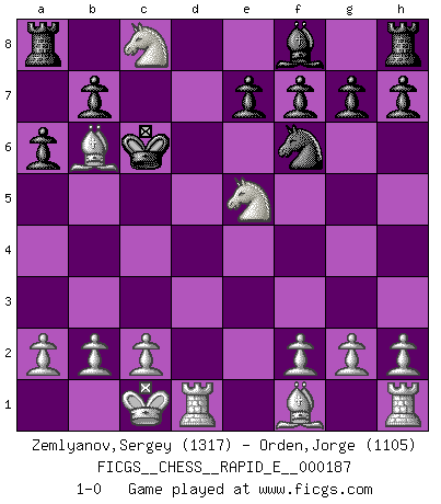 Last move : 1-0 2017 July 17 22:6:59 [Event "FICGS__CHESS__RAPID_E__000187"] [Site "FICGS"] [Date "2017.06.22"] [Round "1"] [White "Zemlyanov,Sergey"] [Black "Orden,Jorge"] [Result "1-0"] [WhiteElo "1317"] [BlackElo "1105"] 1.e4 c5 2.Nf3 d5 3.exd5 Qxd5 4.Nc3 Qd8 5.d4 cxd4 6.Qxd4 Qxd4 7.Nxd4 a6 8.Nd5 Kd8 9.Nb6 Ra7 10.Be3 Nd7 11.Nf3 Nc5 12.O-O-O Kc7 13.Bxc5 Nf6 14.Nxc8 Ra8 15.Bb6+ Kc6 16.Ne5+ 1-0 Sicilian defense Queenside Castling by player White (move 12) Player White won this chess game. Follow this game move after move (download)If cunning alone were needed to excel, women would be the best Chess players. (Albin) Das Blackmar-Diemer-Gambit verändert den ganzen Menschen! (Emil Joseph Diemer) Me gusta decir que Bobby Fischer fue el mejor jugador que jamás haya existido. Pero lo que hizo de Fischer un genio, fue su habilidad de mezclar una frescura y pragmatismo Americano con ideas Rusas acerca de la estrategia. (Bruce Pandolfini) À la honte des hommes, on sait que les lois du jeu sont les seules qui soient partout justes, claires, inviolables et exécutées. Pourquoi l'Indien qui a donné les règles du jeu d'échecs est-il obéi de bon gré dans toute la terre, et que les décrétales des papes, par exemple, sont aujourd'hui un objet d'horreur et de mépris ? C'est que l'inventeur des échecs combina tout avec justesse pour la satisfaction des joueurs, et que les papes, dans leurs décrétales, n'eurent en vue que leur seul avantage. L'Indien voulut exercer également l'esprit des hommes et leur donner du plaisir; les papes ont voulu abrutir l'esprit des hommes. Voltaire (Dictionnaire philosophique / Garnier 1967) All the troubles of the world come from being unable to sit alone in a quiet room. (Blaise Pascal)