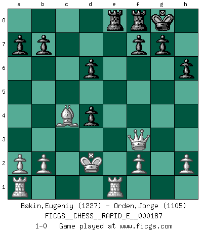 Last move : 1-0 2017 July 28 19:36:18 [Event "FICGS__CHESS__RAPID_E__000187"] [Site "FICGS"] [Date "2017.06.22"] [Round "1"] [White "Bakin,Eugeniy"] [Black "Orden,Jorge"] [Result "1-0"] [WhiteElo "1227"] [BlackElo "1105"] 1.e4 c5 2.Nf3 d6 3.d4 cxd4 4.Qxd4 Nc6 5.Qa4 Nf6 6.Bd3 e5 7.O-O Be7 8.Nc3 O-O 9.Nd5 Bg4 10.Bg5 Bxf3 11.gxf3 h6 12.Bxf6 Bxf6 13.Nxf6+ Qxf6 14.Rfd1 Qxf3 15.Bc4 Nd4 16.c3 Qg4+ 17.Kf1 Qf3 18.cxd4 exd4 19.Qb3 Qxe4 20.Re1 Qh1+ 21.Ke2 Rae8+ 22.Kd2 Qf3 23.Qxf3 1-0 Sicilian, Chekhover variation Kingside Castling by player White (move 7) Kingside Castling by player Black (move 8) Player White won this chess game. Follow this game move after move (download)Of Chess it has been said that life is not long enough for it, but that is the fault of life, not Chess. (William Ewart Napier) Ich verachte die Medien. (Robert James Fischer) Morphy probablemente fue el genio más grande de todos. (Bobby Fischer) Le succès, c'est être capable d'aller d'échec en échec sans perdre son enthousiasme. (Winston Churchill) Creativity is allowing yourself to make mistakes. Art is knowing which ones to keep. (Scott Adams)