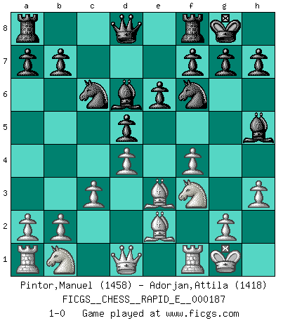 Last move : 1-0 2017 August 8 1:42:54 [Event "FICGS__CHESS__RAPID_E__000187"] [Site "FICGS"] [Date "2017.06.22"] [Round "1"] [White "Pintor,Manuel"] [Black "Adorjan,Attila"] [Result "1-0"] [WhiteElo "1458"] [BlackElo "1418"] 1.e4 c6 2.f4 d5 3.exd5 cxd5 4.d4 Nc6 5.Nf3 Bg4 6.c3 e6 7.Bb5 Nf6 8.O-O Bd6 9.h3 Bh5 10.Be3 O-O 11.Be2 1-0 This chess game has been lost on time (started : 2017.06.22 20:2:41) Caro-Kann defense Kingside Castling by player White (move 8) Kingside Castling by player Black (move 10) Player White won this chess game. Follow this game move after move (download)Is Bobby Fischer quite sane ? (Salo Flohr) Immer nach dem besten Zug zu suchen ist ziemlich unpraktisch. (Nigel Short) Una mala movida nulifica cuarenta buenas. (Horowitz) La victoire dans une partie d'Echecs appartient la plupart du temps à celui qui voit un peu plus loin que l'adversaire. (Lasker) Logic : The art of thinking and reasoning in strict accordance with the limitations and incapacities of the human misunderstanding. (Ambrose Bierce)