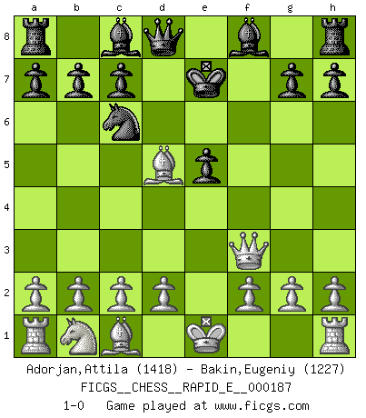Last move : 1-0 2017 July 29 13:16:54 [Event "FICGS__CHESS__RAPID_E__000187"] [Site "FICGS"] [Date "2017.06.22"] [Round "1"] [White "Adorjan,Attila"] [Black "Bakin,Eugeniy"] [Result "1-0"] [WhiteElo "1418"] [BlackElo "1227"] 1.e4 e5 2.Nf3 Nc6 3.Bc4 Nf6 4.Ng5 d5 5.exd5 Nxd5 6.Nxf7 Kxf7 7.Qf3+ Ke7 8.Bxd5 1-0 Two knights defense : Fegatello attack Player White won this chess game. Follow this game move after move (download)In life, as in Chess, one's own Pawns block one's way. A man's very wealth, ease, leisure, children, books, which should help him to win, more often checkmate him. (Charles Buxton) Im Internet Chess Club betrug mein Rating vorübergehend 3350 ELO-Punkte. (Sergej Karjakin) De eso se trata el Ajedrez. Un día le das una lección a tu oponente y al día siguiente el te da una a tí. (Bobby Fischer) Avec des compensations pour le matériel en plus... (Anonyme) The intuitive mind is a sacred gift; the rational mind is a faithful servant. We have created a society that honors the servant but has forgotten the gift. (Albert Einstein)