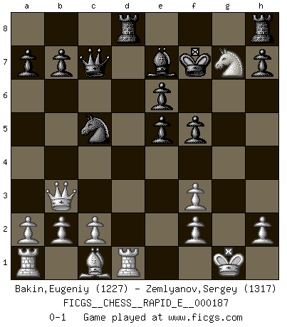 Last move : 0-1 2017 August 2 14:50:54 [Event "FICGS__CHESS__RAPID_E__000187"] [Site "FICGS"] [Date "2017.06.22"] [Round "1"] [White "Bakin,Eugeniy"] [Black "Zemlyanov,Sergey"] [Result "0-1"] [WhiteElo "1227"] [BlackElo "1317"] 1.e4 c5 2.Nf3 d6 3.d4 cxd4 4.Qxd4 Nc6 5.Bb5 Bd7 6.Bxc6 Bxc6 7.O-O Nf6 8.Nc3 e6 9.Rd1 Be7 10.e5 Bxf3 11.gxf3 dxe5 12.Qa4+ Nd7 13.Ne4 f5 14.Ng3 Qc7 15.Nh5 Rd8 16.Nxg7+ Kf7 17.Qb3 Nc5 0-1 Sicilian, Chekhover variation Kingside Castling by player White (move 7) Player Black won this chess game. Follow this game move after move (download)Human affairs are like a Chess game: only those who do not take it seriously can be called good players. (Hung Tzu Ch'eng) Kleine Schachspieler machen Mist, und große Schachspieler machen Mist, aber große machen weniger Mist. (Fritz Sämisch) Nada excita más a Grandes Maestros aburridos que una novedad teórica. (Dominic Lawson) Vous n'êtes pas toujours obligé de jouer le meilleur coup. Un coup doit être actif, entreprenant, correct et beau ! (David Bronstein) All men can see these tactics whereby I conquer, but what none can see is the strategy out of which victory is evolved. (Sun Tzu)