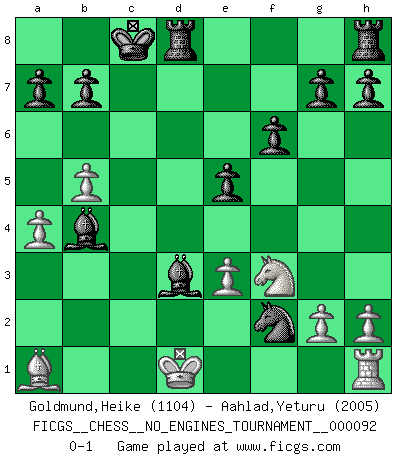 Last move : 0-1 2017 October 14 9:7:10 [Event "FICGS__CHESS__NO_ENGINES_TOURNAMENT__000092"] [Site "FICGS"] [Date "2017.06.23"] [Round "1"] [White "Goldmund,Heike"] [Black "Aahlad,Yeturu"] [Result "0-1"] [WhiteElo "1104"] [BlackElo "2005"] 1.b4 e5 2.Bb2 f6 3.a3 d5 4.e3 Be6 5.d3 c5 6.c4 Nc6 7.b5 Na5 8.Nf3 dxc4 9.dxc4 Qxd1+ 10.Kxd1 O-O-O 11.Nbd2 Nxc4 12.Kc2 Nd6 13.Rc1 Ne7 14.Nc4 Nxc4 15.Bxc4 Bxc4 16.a4 Bd3+ 17.Kb3 c4+ 18.Kc3 Nd5+ 19.Kd2 Bb4+ 20.Kd1 c3 21.Ba1 Ba3 22.Rxc3+ Nxc3+ 23.Kd2 Ne4+ 24.Ke1 Bb4+ 25.Kd1 Nxf2+ 0-1 Polish (Sokolsky) opening Queenside Castling by player Black (move 10) Player Black won this chess game. Follow this game move after move (download)One doesn't have to play well, it's enough to play better than your opponent. (Siegbert Tarrasch) Es war undenkbar für die Behörden, dass ein sowjetischer Großmeister auf diese Art und Weise [Fischer-Taimanov 6:0] verliert, ohne dass es eine politischer Erklärung dafür gäbe. (Mark Taimanov) El Ajedrez hace al hombre ser mas sabio y ver mas claro. (Vladimir Putin) Les Echecs ont trois composantes : le temps, l'espace et le matériel en dernier. (Mikhail Tal) The only sure thing about luck is that it will change. (Wilson Mizner)
