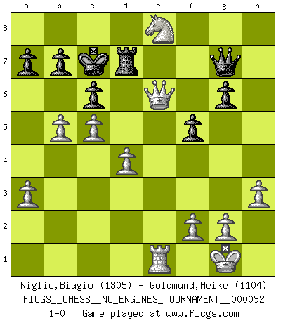 Last move : 1-0 2017 October 14 9:7:23 [Event "FICGS__CHESS__NO_ENGINES_TOURNAMENT__000092"] [Site "FICGS"] [Date "2017.06.23"] [Round "1"] [White "Niglio,Biagio"] [Black "Goldmund,Heike"] [Result "1-0"] [WhiteElo "1305"] [BlackElo "1104"] 1.e4 d5 2.exd5 Qxd5 3.Nc3 Qa5 4.d4 Nf6 5.Nf3 Bf5 6.Bc4 e6 7.O-O c6 8.Bd2 Nbd7 9.Re1 Qc7 10.a3 Bd6 11.h3 Nb6 12.Be2 O-O-O 13.b4 Nbd5 14.Nxd5 Nxd5 15.c4 Nf4 16.Bf1 Nd3 17.Bxd3 Bxd3 18.c5 Bf4 19.Bxf4 Qxf4 20.Qxd3 Rd5 21.Re4 Qf5 22.Re3 Qf6 23.Rae1 Rhd8 24.Re5 R5d7 25.Qxh7 g6 26.Qh4 Qg7 27.Qe4 Re8 28.Nd2 Qh6 29.Nc4 Kc7 30.Nd6 R8e7 31.b5 f6 32.Rxe6 f5 33.Qe5 Rxe6 34.Qxe6 Qg7 35.Ne8+ 1-0 Scandinavian defense Kingside Castling by player White (move 7) Queenside Castling by player Black (move 12) Player White won this chess game. Follow this game move after move (download)Chess books should be used as we use glasses: to assist the sight, although some players make use of them as if they thought they conferred sight. (Jose Raul Capablanca) Wenn sie aufgeben, dann danke ich Ihnen für das Spiel (Eventualzug beim Fernschach). (Anonymous) La pasion por jugar al Ajedrez es una de las mas inexplicables en el mundo. (H.G. Wells) Je fais ceci parce que dans cinquante coups j'obtiendrai cela; je m'appelle Mikhail Moisevitch Botvinnik. (Botvinnik) The meaning of life is that it is to be lived, and it is not to be traded and conceptualized and squeezed into a pattern of systems. (Bruce Lee)
