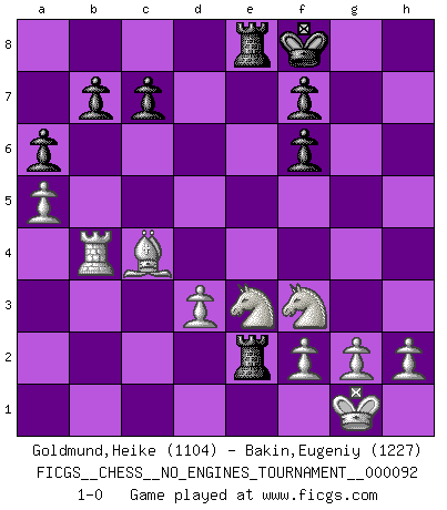 Last move : 1-0 2017 August 21 15:27:7 [Event "FICGS__CHESS__NO_ENGINES_TOURNAMENT__000092"] [Site "FICGS"] [Date "2017.06.23"] [Round "1"] [White "Goldmund,Heike"] [Black "Bakin,Eugeniy"] [Result "1-0"] [WhiteElo "1104"] [BlackElo "1227"] 1.e4 e5 2.Nf3 Nc6 3.Bc4 Qf6 4.c3 Bc5 5.d3 h6 6.b4 Bb6 7.a4 a6 8.a5 Ba7 9.O-O d6 10.Be3 Nge7 11.Nbd2 O-O 12.Qc2 Be6 13.Ba2 d5 14.Bxa7 Nxa7 15.exd5 Nxd5 16.Nc4 Nc6 17.Rfe1 e4 18.Rxe4 Nxc3 19.Rxe6 Qxe6 20.Qxc3 Rfe8 21.Ne3 Qe7 22.Nf5 Qf6 23.Qxf6 gxf6 24.Nxh6+ Kg7 25.Nf5+ Kf8 26.Rb1 Nxb4 27.Rxb4 Re2 28.Bc4 Rae8 29.Ne3 1-0 King's pawn game Kingside Castling by player White (move 9) Kingside Castling by player Black (move 11) Player White won this chess game. Follow this game move after move (download)Place the contents of the Chess box in a hat, shake them up vigorously, pour them on the board from a height of two feet, and you get the style of Steinitz. (H. E. Bird) Jeder leidlich begabte Spieler, er braucht keineswegs hervorragend veranlagt zu sein, kann es zum Meister bringen. Aber das ist ja auch gar nicht nötig! Der richtige Standpunkt ist es, zu seinem Vergnügen zu spielen, und man glaube ja nicht, dass der Genuss proportional dem Können sei. (Siegbert Tarrasch) Antes de los Finales, los dioses han colocado el Juego Medio. (Siegbert Tarrasch) J'ai toujours senti une vague pitié pour l'homme qui ne connaît rien aux échecs, tout comme j'en aurais pour un homme ignorant de l'amour. Les Echecs, comme la musique ou comme l'amour, ont le pouvoir de rendre heureux. (Siegbert Tarrasch) If we knew what we were doing, we would not call it research. (Albert Einstein)
