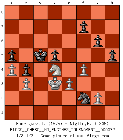Last move : 1/2-1/2 2017 November 10 12:11:8 [Event "FICGS__CHESS__NO_ENGINES_TOURNAMENT__000092"] [Site "FICGS"] [Date "2017.06.23"] [Round "1"] [White "Rodriguez,Juan Antonio"] [Black "Niglio,Biagio"] [Result "1/2-1/2"] [WhiteElo "1575"] [BlackElo "1305"] 1.d4 d5 2.Bf4 Nf6 3.Nf3 e6 4.e3 Bd6 5.Bg3 b6 6.Bb5+ c6 7.Bd3 Ba6 8.Qe2 Bxd3 9.Qxd3 Qc7 10.c4 Nbd7 11.Nc3 Bxg3 12.hxg3 h6 13.cxd5 exd5 14.Rc1 Qd6 15.a3 a5 16.O-O O-O 17.Rc2 Rac8 18.Rfc1 Rfe8 19.Ne2 c5 20.b3 Rc7 21.Qf5 Rec8 22.Ne5 cxd4 23.Rxc7 Rxc7 24.Rxc7 Qxc7 25.Nxd7 Qxd7 26.Qxd7 Nxd7 27.Nxd4 g6 28.Kf1 Kf8 29.Ke2 Ke7 30.Kd3 Ne5+ 31.Ke2 Kd6 32.f4 Nd7 33.Kd3 Nc5+ 34.Kc3 Ne4+ 35.Kd3 Nxg3 36.Kc3 Ne4+ 37.Kc2 h5 38.Kd3 Kc5 39.Kc2 b5 40.Kd3 Nf2+ 41.Kc3 Ne4+ 42.Kd3 b4 43.a4 Nf2+ 44.Kd2 Ne4+ 45.Kd3 Nf2+ 46.Kd2 Ne4+ 47.Kd3 Nf2+ 1/2-1/2 Queen's pawn, Mason variation Kingside Castling by player White (move 16) Kingside Castling by player Black (move 16) This chess game ended in a draw. Follow this game move after move (download)Adequate compensation for a sacrifice is having a sound combination leading to a winning position; adequate compensation for a blunder is having your opponent snatch defeat from the jaws of victory. (Bruce A. Moon) Kasparov stellt für gewöhnlich die Regeln auf und bricht sie dann selbst wieder. (Alexej Shirov) Un Peón pasado aumenta su poder a medida de que el número de piezas en el tablero disminuye. (Capablanca) Tout change constamment, y compris dans le monde des Echecs. (Botvinnik) Creativity is allowing yourself to make mistakes. Art is knowing which ones to keep. (Scott Adams)