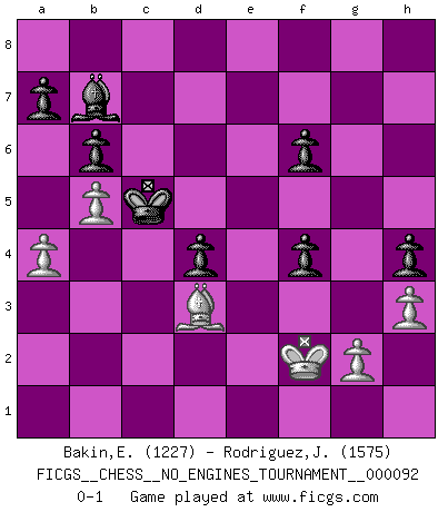 Last move : 0-1 2017 August 17 16:51:24 [Event "FICGS__CHESS__NO_ENGINES_TOURNAMENT__000092"] [Site "FICGS"] [Date "2017.06.23"] [Round "1"] [White "Bakin,Eugeniy"] [Black "Rodriguez,Juan Antonio"] [Result "0-1"] [WhiteElo "1227"] [BlackElo "1575"] 1.e4 c6 2.d4 d5 3.Nc3 dxe4 4.Nxe4 Nd7 5.Nf3 Ngf6 6.Nfd2 Nxe4 7.Nxe4 Nf6 8.Bd3 Qxd4 9.c3 Qe5 10.f4 Qa5 11.Be3 e6 12.Bc2 Be7 13.Nxf6+ Bxf6 14.Qd3 Qd5 15.Rd1 Qxd3 16.Rxd3 b6 17.O-O g6 18.f5 gxf5 19.Bh6 Bb7 20.b4 Ke7 21.Rfd1 Rhd8 22.Be3 Rxd3 23.Rxd3 Rd8 24.a4 Rxd3 25.Bxd3 Bxc3 26.b5 c5 27.Bf4 e5 28.Bg5+ f6 29.Bh6 e4 30.Bc4 Be5 31.Bg8 e3 32.Bxe3 h5 33.Bc4 f4 34.Bf2 Bd4 35.h3 h4 36.Bxd4 cxd4 37.Kf2 Kd6 38.Bd3 Kc5 0-1 Caro-Kann : Steinitz variation Kingside Castling by player White (move 17) Player Black won this chess game. Follow this game move after move (download)For surely of all the drugs in the world, Chess must be the most permanently pleasurable. (Assiac) Bogoljubow: Matt in vier Zügen! Tartakower: Ich verbitte mir jede Belästigung! (Savielly Grigorievitsch Tartakower) a manera como él juega al Ajedrez, demuestra la completa naturaleza de un hombre. (Stanley Ellin) On peut tirer plus d'utilité d'une partie perdue que de 100 parties gagnées. (Capablanca) Don't anthropomorphize computers - they hate it. (Anonymous)