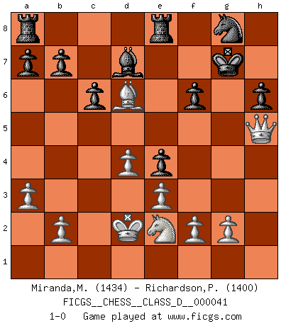 Last move : 1-0 2007 May 4 19:47:56 [Event "FICGS__CHESS__CLASS_D__000041"] [Site "FICGS"] [Date "2007.04.09"] [Round "1"] [White "Miranda,Marcus"] [Black "Richardson,Patrick"] [Result "1-0"] [WhiteElo "1434"] [BlackElo "1400"] 1.d4 Nf6 2.c4 e6 3.Nc3 Bb4 4.Qc2 d5 5.cxd5 exd5 6.Bg5 O-O 7.e3 h6 8.Bh4 Nc6 9.Bd3 Ba5 10.a3 Bxc3+ 11.Qxc3 g5 12.Bg3 Ne4 13.Bxe4 dxe4 14.h4 Re8 15.hxg5 Qxg5 16.Rc1 Ne7 17.Nh3 Qh5 18.Nf4 Qxh1+ 19.Kd2 Qxc1+ 20.Qxc1 c6 21.Qh1 Kh7 22.Qh4 Ng8 23.Qh5 Kg7 24.Ne2 Bd7 25.Be5+ f6 26.Bd6 1-0 Nimzo-Indian : Classical, Noa variation, 5.cd ed Kingside Castling by player Black (move 6) Player White won this chess game. Follow this game move after move (download)It is the aim of the modern school, not to treat every position according to one general law, but according to the principle inherent in the position. (Richard Reti) Im Leben werden Partien nie so unstrittig gewonnen wie im Spiel (Emanuel Lasker) Por la belleza de sus partidas, la claridad de su juego y lo brillante de sus ideas, Fischer se creó el mismo como un artista de la misma estatura como Brahms, Rembrandt y Shakespeare. (David Levy) Un footballeur joue avec ses pieds, parfois avec sa tête. Un joueur d'échecs ne joue qu'avec sa tête. Et quand il ne joue plus, il meurt. (Jacob Murray) If everyone is thinking alike, then somebody isn't thinking. (US General George S. Patton)