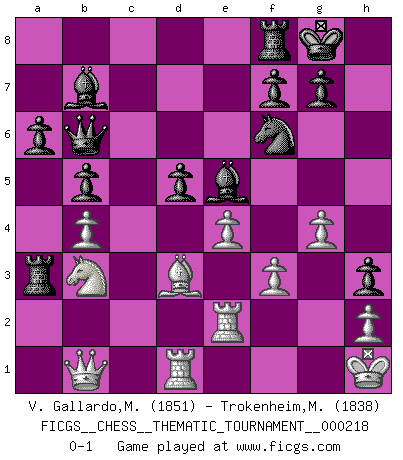 Last move : 0-1 2017 November 22 5:21:26 [Event "FICGS__CHESS__THEMATIC_TOURNAMENT__000218"] [Site "FICGS"] [Date "2017.07.01"] [Round "1"] [White "V. Gallardo,Miguel"] [Black "Trokenheim,Marek"] [Result "0-1"] [WhiteElo "1851"] [BlackElo "1838"] 1.e4 c5 2.Nf3 a6 3.d4 cxd4 4.Nxd4 e6 5.a3 b5 6.Bd2 Bb7 7.Bd3 Qc7 8.O-O Nf6 9.f3 Bc5 10.c3 e5 11.b4 Bb6 12.Be3 exd4 13.cxd4 Nc6 14.Kh1 Nxd4 15.Bxd4 Bxd4 16.Ra2 Be5 17.g3 h5 18.Rc2 Qd6 19.Rg2 h4 20.g4 O-O 21.Re2 Rac8 22.Qb3 h3 23.Rd1 Qb6 24.Nd2 Rc3 25.Qb1 Rxa3 26.Nb3 d5 0-1 This chess game has been lost on time (started : 2017.07.01 8:48:54) Sicilian : O'Kelly variation Kingside Castling by player White (move 8) Kingside Castling by player Black (move 20) Player Black won this chess game. Follow this game move after move (download)Winning isn't everything... but losing is nothing. (Mednis) Obendrein hat der FIDE-Präsident den Revolutionsführer Gaddafi zum »Großmeister« ernannt, am Ende der WM. Das ist lächerlich! (Joel Lautier) Todo se encuentra en un estado de flujo y esto incluye al mundo del Ajedrez. (Mikhail Botvinnik) Psychologiquement, tu dois avoir confiance en toi même, mais cette confiance doit être basée sur des faits. (Robert Fischer) What doesn't kill us makes us stronger. (Friedrich Nietzsche)