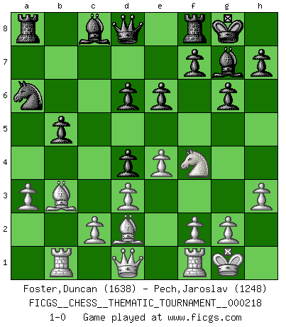 Last move : 1-0 2017 October 30 12:6:42 [Event "FICGS__CHESS__THEMATIC_TOURNAMENT__000218"] [Site "FICGS"] [Date "2017.07.01"] [Round "1"] [White "Foster,Duncan"] [Black "Pech,Jaroslav"] [Result "1-0"] [WhiteElo "1638"] [BlackElo "1248"] 1.e4 c5 2.Nf3 a6 3.a3 d6 4.b4 Nf6 5.Nc3 Nc6 6.b5 axb5 7.Bxb5 g6 8.O-O Bg7 9.Rb1 O-O 10.h3 Nd4 11.d3 Ne8 12.Nxd4 cxd4 13.Nd5 e6 14.Nf4 Nc7 15.Bc4 b5 16.Bb3 Na6 17.Bd2 1-0 This chess game has been lost on time (started : 2017.07.01 8:48:54) Sicilian : O'Kelly variation Kingside Castling by player White (move 8) Kingside Castling by player Black (move 9) Player White won this chess game. Follow this game move after move (download)Look at Garry Kasparov. After he loses, invariably he wins the next game. He just kills the next guy. That's something that we have to learn to be able to do. (Maurice Ashley) Über Karpov: Er war und ist ein Vertreter der russischen Reaktionäre. Das steckt tief in seiner Seele, wehalb ich nicht nett mit ihm umgehen kann. (Viktor Kortschnoi) Hoy en día, si tu no eres un Gran Maestro a los 14 años, es mejor que lo olvides. (Anand Viswanathan) Horreur, mais aussi harmonie suprême : qu'y avait-il en effet au monde en dehors des échecs ? Le brouillard, l'inconnu, le non-être... (Vladimir Nabokov) It's unlucky to be superstitious. (Dave Enteles)
