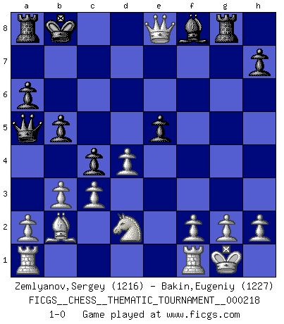 Last move : 1-0 2017 August 20 20:30:25 [Event "FICGS__CHESS__THEMATIC_TOURNAMENT__000218"] [Site "FICGS"] [Date "2017.07.01"] [Round "1"] [White "Zemlyanov,Sergey"] [Black "Bakin,Eugeniy"] [Result "1-0"] [WhiteElo "1216"] [BlackElo "1227"] 1.e4 c5 2.Nf3 a6 3.c3 e6 4.d4 d5 5.Nbd2 Nf6 6.Bd3 c4 7.Bc2 b5 8.b3 Qa5 9.Bb2 Bb7 10.e5 Ne4 11.Nxe4 dxe4 12.Nd2 f5 13.exf6 gxf6 14.Bxe4 Nc6 15.Qh5+ Kd7 16.O-O e5 17.Qf7+ Kc8 18.Qxf6 Rg8 19.Bxc6 Bxc6 20.Qxc6+ Kb8 21.Qe8+ 1-0 Sicilian : O'Kelly variation Kingside Castling by player White (move 16) Player White won this chess game. Follow this game move after move (download)In blitz, the Knight is stronger than the Bishop. (Vlastimil Hort) Korrekt heißt in Deutschland die Haltung eines Mannes, dessen Benehmen nach dem Urteile seiner Nachbarn seiner Stellung angemessen ist. Um korrekt zu sein, muß man sich der Meinung der anderen anpassen... (Emanuel Lasker) Los asuntos humanos son como una partida de Ajedrez: solo aquellos que no lo toman seriamente, pueden ser llamados buenos jugadores. (Hung Tzu Ch'eng) Il s'avisa de me proposer d'apprendre les échecs qu'il jouait un peu... me voilà forcené des échecs. J'achète un échiquier, je m'enferme dans ma chambre, j'y passe des jours et des nuits à vouloir apprendre par cur toutes les parties. (Jean-Jacques Rousseau, Confessions) The only difference between a tax man and a taxidermist is that the taxidermist leaves the skin. (Mark Twain)