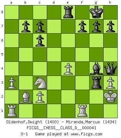 Last move : 0-1 2007 May 10 12:27:7 [Event "FICGS__CHESS__CLASS_D__000041"] [Site "FICGS"] [Date "2007.04.09"] [Round "1"] [White "Oldenhof,Dwight"] [Black "Miranda,Marcus"] [Result "0-1"] [WhiteElo "1400"] [BlackElo "1434"] 1.e4 e5 2.Nf3 Nc6 3.Bb5 a6 4.Bxc6 dxc6 5.d3 Bd6 6.h3 Nf6 7.a3 O-O 8.Nc3 Re8 9.b4 a5 10.bxa5 Rxa5 11.Bb2 Nh5 12.d4 exd4 13.Nxd4 Qf6 14.O-O Nf4 15.Nde2 Nxh3+ 16.gxh3 Rg5+ 17.Ng3 Bxg3 18.fxg3 Rxg3+ 19.Kh2 Qh4 20.Qg4 Bxg4 0-1 Ruy Lopez : Exchange variation Kingside Castling by player Black (move 7) Kingside Castling by player White (move 14) Player Black won this chess game. Follow this game move after move (download)After black's reply to 1.e4 with 1..e5, leaves him always trying to get into the game. (Howard Staunton) Das typische an einem Großmeister ist, daß er eine gewonnene Position schnell und schmerzlos gewinnt. (Irving Chernev) ¿Que sería del Ajedrez sin errores graciosos?. (Kurt Richter) Les échecs, c'est l'imagination. (David Bronstein) Optimism is a variety of information deficit. Sometimes especially true for correspondence chess games. (Michael Aigner)