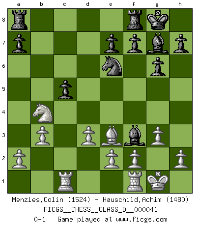 Last move : 0-1 2007 June 15 3:40:32 [Event "FICGS__CHESS__CLASS_D__000041"] [Site "FICGS"] [Date "2007.04.09"] [Round "1"] [White "Menzies,Colin"] [Black "Hauschild,Achim"] [Result "0-1"] [WhiteElo "1524"] [BlackElo "1480"] 1.c4 c5 2.Nc3 Nf6 3.g3 d5 4.cxd5 Nxd5 5.Bg2 Nc7 6.d3 Nc6 7.Be3 Ne6 8.Bxc6+ bxc6 9.Nf3 g6 10.Qa4 Qb6 11.O-O Bg7 12.Rac1 O-O 13.b3 Qb4 14.Qxc6 Bb7 15.Nd5 Bxc6 16.Nxb4 Bxf3 0-1 English : Symmetrical, Rubinstein system Kingside Castling by player White (move 11) Kingside Castling by player Black (move 12) Player Black won this chess game. Follow this game move after move (download)We cannot resist the fascination of sacrifice, since a passion for sacrifices is part of a Chessplayer's nature. (Rudolf Spielman) Ich trinke, ich rauche, ich spiele, ich liebe Frauen aber Fernschach ist ein Laster, das ich nicht habe. (Mikhail Nekhemyevich Tal) El Peón aislado arroja penumbra sobre todo el tablero. (Aaron Nimzovich) En blitz, le Cavalier l'emporte sur le Fou. (Vlastimil Hort) If only people were all showed a certain minimum level of niceness; if only people didn't retract verbal draw offers (without draw box ticked) on ficgs; if only people didn't kill; if only people didn't run concentration / extermination camps, if only people didn't drop nuclear bombs on Hiroshima and Nagasaki, and so on - it would be a much more beautiful world. But sadly, things are not so... (Normajean Yates)