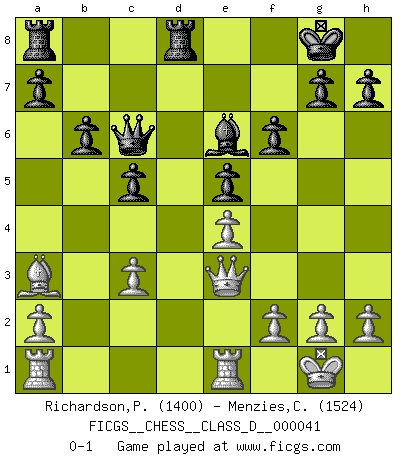 Last move : 0-1 2007 June 16 4:14:52 [Event "FICGS__CHESS__CLASS_D__000041"] [Site "FICGS"] [Date "2007.04.09"] [Round "1"] [White "Richardson,Patrick"] [Black "Menzies,Colin"] [Result "0-1"] [WhiteElo "1400"] [BlackElo "1524"] 1.e4 e5 2.Nf3 Nc6 3.d4 exd4 4.Bc4 Bb4+ 5.c3 dxc3 6.Nxc3 Bxc3+ 7.bxc3 d6 8.Qb3 Qe7 9.O-O Nf6 10.Ba3 O-O 11.Rfe1 Na5 12.Qb5 Nxc4 13.Qxc4 Be6 14.Qb4 c5 15.Qb1 Qd7 16.Rd1 Qc6 17.Re1 Nd7 18.Qc2 Ne5 19.Nxe5 dxe5 20.Qd2 Rfd8 21.Qg5 f6 22.Qe3 b6 0-1 Scotch gambit Kingside Castling by player White (move 9) Kingside Castling by player Black (move 10) Player Black won this chess game. Follow this game move after move (download)You sit at the board and suddenly your heart leaps. Your hand trembles to pick up the piece and move it. But what Chess teaches you is that you must sit there calmly and think about whether it's really a good idea and whether there are other better ideas. (Stanley Kubrick) Schach ist ein schwarz-weisser Dschungel. (Garry Kasparov) Del Ajedrez se ha dicho que la vida no es lo suficientemente larga para él, pero eso es culpa de la vida, no del Ajedrez. (William Ewart Napier) Les Echecs ne sont pas pour les âmes timides. Ils requièrent un homme entier, qui ne s'arrête pas aveuglément à ce qui a été déjà établi, mais qui tente individuellement de sonder les profondeurs du jeu. (W. Steinitz) If you are good, you will be assigned all the work. If you are really good, you will get out of it. (Dan Rotaru)
