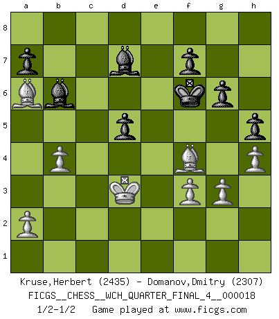 Last move : 1/2-1/2 2017 October 23 15:57:34 [Event "FICGS__CHESS__WCH_QUARTER_FINAL_4__000018"] [Site "FICGS"] [Date "2017.07.01"] [Round "5"] [White "Kruse,Herbert"] [Black "Domanov,Dmitry"] [Result "1/2-1/2"] [WhiteElo "2435"] [BlackElo "2307"] 1.c4 Nf6 2.Nf3 c5 3.Nc3 Nc6 4.e3 e5 5.Be2 d5 6.d4 exd4 7.exd4 cxd4 8.Nxd4 dxc4 9.Nxc6 Qxd1+ 10.Nxd1 bxc6 11.Bxc4 Bd6 12.O-O O-O 13.Nc3 Bf5 14.h3 Bc7 15.Be2 Rfe8 16.Be3 Rab8 17.b3 Bb6 18.Rad1 h6 19.Rd6 Re6 20.Rxe6 Bxe6 21.Rd1 Kf8 22.Bc1 Rd8 23.Rxd8+ Bxd8 24.Bf3 Nd5 25.Nxd5 cxd5 26.Kf1 Ke8 27.Be2 Bb6 28.Bb2 g6 29.Bc1 h5 30.Ba6 Kd7 31.Ke2 Bc5 32.Bd2 Kd6 33.b4 Bd4 34.Bh6 Bd7 35.Be3 Bb6 36.Bf4+ Ke6 37.f3 Kf5 38.Bb8 Kg5 39.Kd2 Kf6 40.h4 Ke6 41.Bf4 Kf6 42.Kd3 Kf5 43.g3 Kf6 44.Kd2 Ke6 45.Kd3 Kf6 46.Kd2 Ke6 47.Kd3 Kf6 1/2-1/2 English Opening Kingside Castling by player White (move 12) Kingside Castling by player Black (move 12) This chess game ended in a draw. Follow this game move after move (download)No other master has such a terrific will to win. At the board he radiates danger, and even the strongest opponents tend to freeze, like rabbits when they smell a panther. Even his weaknesses are dangerous. As white, his opening game is predictable - you can make plans against it - but so strong that your plans almost never work. In the middle game his precision and invention are fabulous, and in the end game you simply cannot beat him. (Anonymous German Expert) Nicht daß Diemer aus Opportunismus Mitglied der NSDAP geworden wäre. Er war ein Fanatiker, in allem, was er tat. (Hans Ree) El Ajedrez es un invernadero donde los frutos del carácter pueden madurar mas completamente que en la vida. (Edward Morgan Foster) Les échecs sont un jeu terrible. Si vous n'avez pas le centre, votre adversaire a une position plus libre. Par contre, si vous avez le centre, alors vous avez vraiment quelque chose pour laquelle vous inquiéter ! (Siegbert Tarrasch) There is far too much law for those who can afford it and far too little for those who cannot. (Derek Bok)