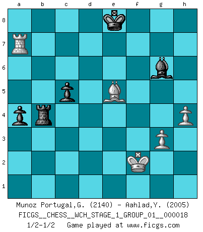 Last move : 1/2-1/2 2017 September 19 8:27:56 [Event "FICGS__CHESS__WCH_STAGE_1_GROUP_01__000018"] [Site "FICGS"] [Date "2017.07.01"] [Round "1"] [White "Munoz Portugal,Guillermo"] [Black "Aahlad,Yeturu"] [Result "1/2-1/2"] [WhiteElo "2140"] [BlackElo "2005"] 1.e4 c5 2.Nf3 e6 3.d4 cxd4 4.Nxd4 a6 5.Nc3 Bb4 6.Qd3 Qc7 7.a3 Bxc3+ 8.Qxc3 Qxc3+ 9.bxc3 d6 10.Bd3 e5 11.Ne2 Nd7 12.c4 Nc5 13.Nc3 f5 14.Be3 Nxd3+ 15.cxd3 Nf6 16.f3 fxe4 17.fxe4 O-O 18.O-O Bd7 19.a4 Rf7 20.Bc1 a5 21.Ra2 Bc6 22.Nd5 Be8 23.Nb6 Ra6 24.Rb2 Bc6 25.h3 Nd7 26.Rxf7 Kxf7 27.Nxd7 Bxd7 28.Rxb7 Ke8 29.Kf2 Bxa4 30.Rxg7 Bc2 31.Ke3 Rb6 32.Rxh7 Rb3 33.c5 dxc5 34.Rc7 Rxd3+ 35.Kf2 Rc3 36.Bb2 Rc4 37.Bxe5 Bxe4 38.g3 a4 39.h4 Bg6 40.Ra7 Rb4 41.Ra6 Bf7 42.Ra7 Bg6 1/2-1/2 Sicilian : Kan, 5.Nc3 Kingside Castling by player Black (move 17) Kingside Castling by player White (move 18) 10 pieces endgame at move 37 : White KRBPP , Black KRBPP WHITE : King + 1 Rook 1 Bishop 2 Pawns BLACK : King + 1 Rook 1 Bishop 2 Pawns This chess game ended in a draw. Follow this game move after move (download)Fischer prefers to enter Chess history alone. (Miguel Najdorf) Am wohlsten fühle ich mich, wenn ich sehe, wie sich mein Gegner im Todeskampf windet. (Robert James Fischer) El muchacho (en ese entonces un niño de 12 años llamado Anatoly Karpov) no tiene ni idea de lo que es el Ajedrez y no hay futuro en absoluto para el en esta profesión. (Mikhail Botvinnik) Une platitude souvent récitée à propos des Echecs est qu'une des choses les plus difficiles à réaliser est de gagner une position gagnante. Cela ne manque pas de sens mais, pour ma part, j'ai toujours trouvé plus difficile de gagner une position perdante. (Tim Krabbe) Luck is when opportunity knocks and you answer. (Anonymous)