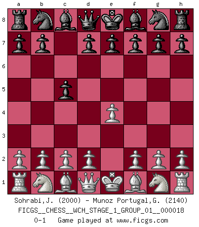 Last move : 0-1 2017 August 2 13:4:2 [Event "FICGS__CHESS__WCH_STAGE_1_GROUP_01__000018"] [Site "FICGS"] [Date "2017.07.01"] [Round "1"] [White "Sohrabi,Jamshid"] [Black "Munoz Portugal,Guillermo"] [Result "0-1"] [WhiteElo "2000"] [BlackElo "2140"] 1.e4 c5 0-1 This chess game has been lost on time (started : 2017.07.01 22:53:52) Sicilian defense Player Black won this chess game. Follow this game move after move (download)Everything is in a state of flux, and this includes the world of Chess. (Mikhail Botvinnik) Bobby Fischer ist kein Vorbild für die heutige Jugend. (Viktor Kortschnoi) El Ajedrez lo es todo: arte, ciencia y deporte. (Anatoly Karpov) La tactique est l'élément le plus important du milieu de jeu. (Siegbert Tarrasch) Kids, you tried your best and you failed miserably. The lesson is, never try. (Simpsons)