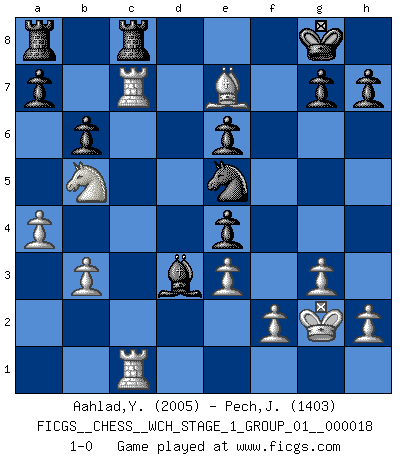 Last move : 1-0 2017 September 30 9:45:31 [Event "FICGS__CHESS__WCH_STAGE_1_GROUP_01__000018"] [Site "FICGS"] [Date "2017.07.01"] [Round "1"] [White "Aahlad,Yeturu"] [Black "Pech,Jaroslav senior"] [Result "1-0"] [WhiteElo "2005"] [BlackElo "1403"] 1.c4 e5 2.g3 Nf6 3.Bg2 d5 4.cxd5 Nxd5 5.Nc3 Nb6 6.e3 Nc6 7.Nge2 Bf5 8.d4 Bd6 9.O-O O-O 10.Nb5 Qd7 11.Nxd6 cxd6 12.dxe5 dxe5 13.Qxd7 Nxd7 14.Nc3 Rfd8 15.b3 Nf6 16.Ba3 Bd3 17.Rfc1 e4 18.Na4 Nd7 19.Bh3 Nce5 20.Rc7 b6 21.Bd6 Nf3+ 22.Kg2 Nf8 23.Be7 Re8 24.Rac1 Ne5 25.Nc3 Ne6 26.Bxe6 fxe6 27.a4 Rec8 28.Nb5 1-0 English Opening Kingside Castling by player White (move 9) Kingside Castling by player Black (move 9) Player White won this chess game. Follow this game move after move (download)Winning isn't everything... but losing is nothing. (Mednis) Die Neutralität betrachte ich als eine schwere Krankheit. (Viktor Kortschnoi) La partida mas dura de ganar es una partida ganada. (Emanuel Lasker) Il n'y a plus de joueurs du niveau de Jacob Murray dont la seule quête est le beau jeu, le plaisir de voir les pièces construire quelque chose. Sur 10 idées à la minute, 9 seront sans intérêt, la dernière s'avèrera géniale. (Christian Bauer) Men never do evil so completely and cheerfully as when they do it from religious conviction. (Blaise Pascal)
