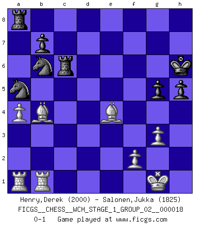Last move : 0-1 2017 November 24 5:41:46 [Event "FICGS__CHESS__WCH_STAGE_1_GROUP_02__000018"] [Site "FICGS"] [Date "2017.07.01"] [Round "1"] [White "Henry,Derek"] [Black "Salonen,Jukka"] [Result "0-1"] [WhiteElo "2000"] [BlackElo "1825"] 1.e4 e5 2.Nf3 Nc6 3.Bc4 Bc5 4.d3 Nf6 5.O-O O-O 6.c3 d5 7.exd5 Nxd5 8.a4 a5 9.Nbd2 Nb6 10.Bb5 f6 11.d4 exd4 12.Nb3 Bd6 13.Nfxd4 Ne5 14.Be2 Re8 15.Nb5 Bf5 16.Bf4 Be6 17.Nxd6 Qxd6 18.Qxd6 cxd6 19.Nd4 Rac8 20.Nxe6 Rxe6 21.Rfd1 d5 22.g3 Re7 23.h4 Nec4 24.Bg4 Rc6 25.b4 g5 26.hxg5 fxg5 27.Bc1 h6 28.Bf3 Rf6 29.Bh1 Rfe6 30.Kf1 Kg7 31.bxa5 Nxa5 32.Ba3 Re8 33.Bb4 Ra8 34.Kg1 Kg6 35.Bg2 h5 36.Rdb1 Rc6 37.c4 Nbxc4 38.Bxd5 Nb6 39.Be4+ Kh6 0-1 This chess game has been lost on time (started : 2017.07.01 22:53:58) Giuoco Pianissimo Kingside Castling by player White (move 5) Kingside Castling by player Black (move 5) Player Black won this chess game. Follow this game move after move (download)I guess a certain amount of temperament is expected of Chess geniuses. (Ron Gross) Schach verlangt totale Konzentration. (Robert James Fischer) En un gambito tu regalas un Peón por el bién de tomar un juego perdido. (Samuel Standige Boden) Le jeu d'échecs fait naître et fortifie en nous plusieurs qualités précieuses dans le cours de l'existence, telles que la prévoyance, la circonspection, la prudence, et la persévérance. (Benjamin Franklin - 1783, la morale des échecs) I can't decide which is riskier; taking crazy risks, or taking advice on crazy risks from a crazy risk taker. (Gregory House in House M.D.)