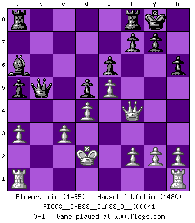 Last move : 0-1 2007 May 28 0:54:1 [Event "FICGS__CHESS__CLASS_D__000041"] [Site "FICGS"] [Date "2007.04.09"] [Round "1"] [White "Elnemr,Amir"] [Black "Hauschild,Achim"] [Result "0-1"] [WhiteElo "1495"] [BlackElo "1480"] 1.e4 e6 2.d4 d5 3.Nc3 Bb4 4.e5 b6 5.Qg4 Bf8 6.Bd3 Nc6 7.Nge2 Nb4 8.Qf3 Ne7 9.Bg5 h6 10.Bh4 Qd7 11.Bxe7 Bxe7 12.Bb5 Nxc2+ 13.Kd1 c6 14.Bxc6 Qxc6 15.Kxc2 b5 16.a3 O-O 17.Rac1 a5 18.Ra1 b4 19.Nf4 Ba6 20.Nh5 bxc3 21.bxc3 Qa4+ 22.Kd2 Bg5+ 23.Nf4 Bxf4+ 24.Qxf4 Qb5 0-1 French : Winawer, Advance variation Kingside Castling by player Black (move 16) Player Black won this chess game. Follow this game move after move (download)It is not a move, even the best move that you must seek, but a realizable plan. (Eugene Znosko-Borovsky) Jeder Schachmeister war einmal ein Anfänger. (Irving Chernev) Una buena memoria, concentración, imaginación y una fuerte voluntad, se requiere para llegar a ser un buen jugador. (Bobby Fischer) Aidez vos pièces, elles vous aideront. (Paul Morphy) Sometimes it pays to stay in bed in Monday, rather than spending the rest of the week debugging Monday's code. (Dan Salomon)