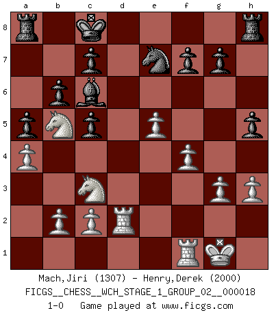 Last move : 1-0 2017 October 9 22:32:2 [Event "FICGS__CHESS__WCH_STAGE_1_GROUP_02__000018"] [Site "FICGS"] [Date "2017.07.01"] [Round "1"] [White "Mach,Jiri"] [Black "Henry,Derek"] [Result "1-0"] [WhiteElo "1307"] [BlackElo "2000"] 1.e4 e5 2.Nf3 Nc6 3.Bb5 Nf6 4.O-O Nxe4 5.d4 Nd6 6.Bxc6 dxc6 7.dxe5 Nf5 8.Qxd8+ Kxd8 9.Nc3 Bd7 10.h3 Be7 11.a4 a5 12.Bg5 h6 13.Bxe7+ Nxe7 14.Rad1 Kc8 15.Nd4 c5 16.Ndb5 Bc6 17.f4 b6 18.Rd2 h5 19.g3 1-0 This chess game has been lost on time (started : 2017.07.01 22:53:58) Ruy Lopez : Berlin defense, Open variation Kingside Castling by player White (move 4) Player White won this chess game. Follow this game move after move (download)First-class players lose to second-class players because second-class players sometimes play a first-class game. (Siegbert Tarrasch) Nur ein wirklich starker Spieler weiß wie schwach er spielt. (Savielly Grigorievitsch Tartakower) Yo jugué Ajedrez con el y a veces le pude haber ganado solo que siempre devuelve su última jugada y juega la partida de manera diferente. (Mark Twain) Plusieurs personnes se sont demandées comment Tal faisait pour gagner... En fait, c'est très simple ! Il met ses pièces au centre de l'échiquier et les sacrifie quelque part ! (David Bronstein) To err is human, to shift the blame on someone else is tactical. (Mladen Jankovic)