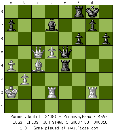 Last move : 1-0 2017 October 10 22:45:39 [Event "FICGS__CHESS__WCH_STAGE_1_GROUP_03__000018"] [Site "FICGS"] [Date "2017.07.01"] [Round "1"] [White "Parmet,Daniel"] [Black "Pechova,Hana"] [Result "1-0"] [WhiteElo "2135"] [BlackElo "1466"] 1.e4 e5 2.Nf3 Nc6 3.Bc4 Nf6 4.Ng5 d5 5.exd5 Na5 6.Bb5+ c6 7.dxc6 bxc6 8.Be2 h6 9.Nf3 e4 10.Ne5 Bd6 11.d4 exd3 12.Nxd3 Qc7 13.b3 O-O 14.Bb2 Ne4 15.Nc3 Nxc3 16.Bxc3 c5 17.h3 c4 18.Qd2 cxd3 19.Bxa5 Qc5 20.cxd3 Bb7 21.d4 Qd5 22.O-O-O Qxg2 23.d5 Qxf2 24.Rhf1 Qh2 25.Bc4 Qxh3 26.Bc3 Rae8 27.Rg1 f6 28.Bb4 Bxb4 29.Qxb4 Bc8 30.Kb2 Bg4 31.Rd2 Bd7 32.R1g2 Qf5 33.a4 Re4 34.Qc5 Qe5+ 35.Ka2 1-0 This chess game has been lost on time (started : 2017.07.01 22:54:0) Two knights defense Kingside Castling by player Black (move 13) Queenside Castling by player White (move 22) Player White won this chess game. Follow this game move after move (download)Chess, like love, like music, has the power to make people happy. (Siegbert Tarrasch) Die Leute spielen gegen mich seit 15 Jahren unter Ihren Möglichkeiten. (Robert James Fischer) Si no le temes a Spassky, entonces elimino el elemento del dinero. (Jim Slater) Les échecs, c'est l'imagination. (David Bronstein) Cactus - It is depressed cucumber. (Ilmars Cirulis)
