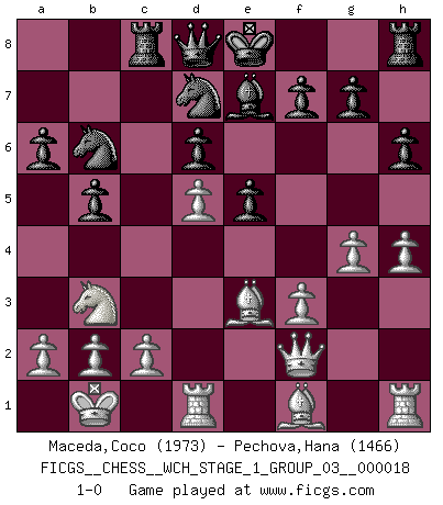 Last move : 1-0 2017 September 9 8:51:4 [Event "FICGS__CHESS__WCH_STAGE_1_GROUP_03__000018"] [Site "FICGS"] [Date "2017.07.01"] [Round "1"] [White "Maceda,Coco"] [Black "Pechova,Hana"] [Result "1-0"] [WhiteElo "1973"] [BlackElo "1466"] 1.e4 c5 2.Nf3 d6 3.d4 cxd4 4.Nxd4 Nf6 5.Nc3 a6 6.Be3 e5 7.Nb3 Be6 8.f3 Nbd7 9.Qd2 Be7 10.g4 h6 11.O-O-O b5 12.h4 Nb6 13.Qf2 Nfd7 14.Kb1 Rc8 15.Nd5 Bxd5 16.exd5 1-0 Sicilian : Najdorf, Byrne (English) attack Queenside Castling by player White (move 11) Player White won this chess game. Follow this game move after move (download)I give 98 percent of my mental energy to Chess. Others give only 2 percent. (Bobby Fischer) Schach ist Leben. (Robert James Fischer) Aquel que teme a un Peón de Reina aislado, debería de retirarse del Ajedrez. (Siegbert Tarrasch) Les erreurs sont comme les malheurs, elles n'arrivent jamais seules. (Siegbert Tarrasch) Treat your password like your toothbrush. Don't let anybody else use it, and get a new one every six months. (Clifford Stoll)