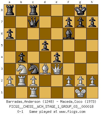 Last move : 0-1 2017 October 2 10:5:38 [Event "FICGS__CHESS__WCH_STAGE_1_GROUP_03__000018"] [Site "FICGS"] [Date "2017.07.01"] [Round "1"] [White "Barradas,Anderson"] [Black "Maceda,Coco"] [Result "0-1"] [WhiteElo "1248"] [BlackElo "1973"] 1.e4 c5 2.Nf3 d6 3.d4 cxd4 4.Nxd4 Nf6 5.Nc3 a6 6.Bc4 e6 7.Bg5 Be7 8.O-O b5 9.Be2 b4 10.Na4 Bd7 11.b3 Bxa4 12.bxa4 Nxe4 13.Bd2 d5 14.Rb1 Nxd2 15.Qxd2 O-O 16.Bd3 Qc7 17.Rfc1 Rc8 18.Rb3 Nd7 19.Nf3 Nc5 20.R3b1 Nxa4 21.Nd4 Nc3 22.Rb2 Bf6 23.Qe3 e5 24.Nb3 e4 0-1 This chess game has been lost on time (started : 2017.07.01 22:54:0) Sicilian : Najdorf, Lipnitzky attack Kingside Castling by player White (move 8) Kingside Castling by player Black (move 15) Player Black won this chess game. Follow this game move after move (download)Not only will I predict his triumph over Botvinnik, but I'll go further and say that he'll probably be the greatest Chess player that ever lived. (John Collins) Es genügt nicht ein guter Spieler zu sein, man muß auch gut spielen. (Siegbert Tarrasch) Un buen sacrificio es aquel que aunque no sea necesariamente sólido, deja a tu oponente aturdido y confuso. (Rudolph Spielmann) Même si vous avez un bon coup à faire, regardez toujours s'il n'y en a pas un qui lui soit préférable. (Pedro Damiano) History is the quarrels of popes and kings, with wars or pestilences in every page; the men all so good for nothing, and hardly any women at all. (Jane Austen)