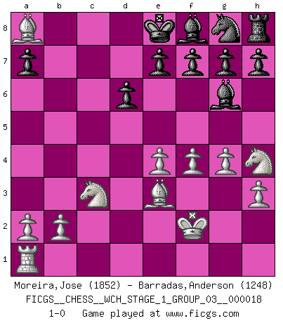 Last move : 1-0 2017 September 7 7:20:16 [Event "FICGS__CHESS__WCH_STAGE_1_GROUP_03__000018"] [Site "FICGS"] [Date "2017.07.01"] [Round "1"] [White "Moreira,Jose"] [Black "Barradas,Anderson"] [Result "1-0"] [WhiteElo "1852"] [BlackElo "1248"] 1.e4 c5 2.Nf3 d6 3.d4 Bg4 4.dxc5 Qa5+ 5.Nc3 Qxc5 6.Be3 Qc8 7.h3 Bh5 8.g4 Bg6 9.Nh4 Qe6 10.Qd3 Nc6 11.f4 Nb4 12.Qb5+ Nc6 13.Qxb7 Qc8 14.Ba6 Nb4 15.Qb5+ Qc6 16.Qxc6+ Nxc6 17.Bb7 Nb4 18.Bxa8 Nxc2+ 19.Kf2 Nxa1 20.Rxa1 1-0 This chess game has been lost on time (started : 2017.07.01 22:54:0) Sicilian Player White won this chess game. Follow this game move after move (download)I'd rather have a Pawn than a finger. (Reuben Fine) Er war ein guter Schachspieler, aber ich kann Leute nicht ausstehen, die 'Heil Hitler' rufen (Über Alexander Aljechin). (Miguel Najdorf) Cuando veas una buena jugada, trata de encontrar otra mejor. (Emanuel Lasker) L'attaque fait le spectacle, la défense gagne les matchs. (Dicton footballistique) Employ the attack like tactic of defense. (Chinese proverb)