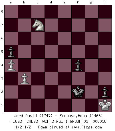 Last move : 1/2-1/2 2018 January 16 13:52:49 [Event "FICGS__CHESS__WCH_STAGE_1_GROUP_03__000018"] [Site "FICGS"] [Date "2017.07.01"] [Round "1"] [White "Ward,David"] [Black "Pechova,Hana"] [Result "1/2-1/2"] [WhiteElo "1747"] [BlackElo "1466"] 1.e4 c6 2.d4 d5 3.Nd2 dxe4 4.Nxe4 Bf5 5.Ng3 Bg6 6.h4 h6 7.Nf3 Nd7 8.Bd3 Bxd3 9.Qxd3 Qc7 10.Bd2 Ngf6 11.O-O e6 12.Rfe1 Be7 13.c4 O-O 14.Bc3 Rad8 15.Rad1 Rfe8 16.Qe2 a5 17.a3 Ng4 18.Rd2 b6 19.Red1 Nf8 20.a4 c5 21.Nf1 h5 22.g3 Nd7 23.d5 exd5 24.Rxd5 Ndf6 25.Bxf6 Bxf6 26.Qc2 Rxd5 27.Rxd5 g6 28.b3 Qe7 29.Kg2 Kf8 30.Qd3 Ba1 31.Qd1 Bg7 32.Rd7 Qe2 33.Qxe2 Rxe2 34.Rd2 Rxd2 35.N1xd2 Ke7 36.Kf1 Nh6 37.Ke2 Nf5 38.Kd1 Bd4 39.Ne4 f6 40.Ke2 Ke6 41.Kd3 Bb2 42.Ng1 Nd4 43.Nh3 Bc1 44.Nc3 g5 45.Nd5 Kf5 46.Ng1 gxh4 47.gxh4 Kg4 48.Nxb6 Ba3 49.Nd7 f5 50.Ne2 Nxe2 51.Kxe2 Kxh4 52.Ne5 Kh3 53.Kf1 Bb2 54.Nc6 Bc3 55.Nd8 h4 56.Ne6 Bb4 57.Nf4+ Kg4 58.Nd3 Bc3 59.Nxc5 Kf3 60.Ne6 Be5 61.c5 h3 62.Ng5+ Kg4 63.Nf7 Bc7 64.Kg1 f4 65.Nd6 Kf3 66.Nb5 Be5 67.c6 h2+ 68.Kh1 Kxf2 69.c7 Bxc7 70.Nxc7 1/2-1/2 Caro-Kann : 3.Nd2 Kingside Castling by player White (move 11) Kingside Castling by player Black (move 13) 10 pieces endgame at move 68 : White KNPPP , Black KBPPP WHITE : King + 1 Knight 3 Pawns BLACK : King + 1 Bishop 3 Pawns 9 pieces endgame at move 69 : White KNPP , Black KBPPP WHITE : King + 1 Knight 2 Pawns BLACK : King + 1 Bishop 3 Pawns 8 pieces endgame at move 70 : White KNPP , Black KPPP WHITE : King + 1 Knight 2 Pawns BLACK : King + 3 Pawns This chess game ended in a draw. Follow this game move after move (download)I'm not afraid of Spassky. The world knows I'm the best. You don't need a match to prove it. (Bobby Fischer) Fischer: 'Remis!?' Uhlmann: 'Aber es muss doch dreimal Zugwiederholung sein!' Fischer: 'Sie nehmen das Remis an, wie ich es sage, sonst spiele ich weiter und werde Sie dann schlagen!' (Robert James Fischer) El Ajedrez es despiadado: debes de estar preparado para matar gente. (Nigel Short) La vie et les Echecs sont tous les deux une lutte constante. (Lasker) Real knowledge is to know the extent of one's ignorance. (Confucius)