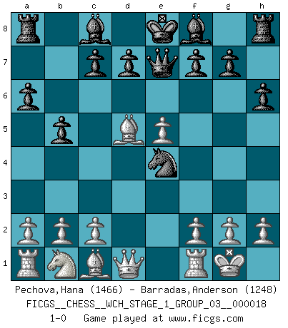 Last move : 1-0 2017 September 17 8:28:51 [Event "FICGS__CHESS__WCH_STAGE_1_GROUP_03__000018"] [Site "FICGS"] [Date "2017.07.01"] [Round "1"] [White "Pechova,Hana"] [Black "Barradas,Anderson"] [Result "1-0"] [WhiteElo "1466"] [BlackElo "1248"] 1.e4 e5 2.Nf3 Nc6 3.Bb5 a6 4.Ba4 Nf6 5.O-O b5 6.Bb3 h6 7.d4 Nxe4 8.Nxe5 Nxe5 9.dxe5 Qe7 10.Bd5 1-0 This chess game has been lost on time (started : 2017.07.01 22:54:0) Ruy Lopez : 5.O-O Kingside Castling by player White (move 5) Player White won this chess game. Follow this game move after move (download)I give 98 percent of my mental energy to Chess. Others give only 2 percent. (Bobby Fischer) Schach verlangt totale Konzentration. (Robert James Fischer) Un sacrificio se refuta mucho mejor al aceptarlo. (Wilhelm Steinitz) Ne tendez aucun piège pour le plaisir ! Ne jouez rien dans l'espoir que l'adversaire réagisse de façon stupide ! Prenez toujours pour acquis que l'adversaire va trouver le meilleur coup ! Ne jouez jamais de coup dans l'espoir que l'adversaire ne voie pas la menace ! Chacun de vos coups doit améliorer la position d'une façon ou d'une autre. Even the best needles are not sharp at both ends. (Chinese proverb)