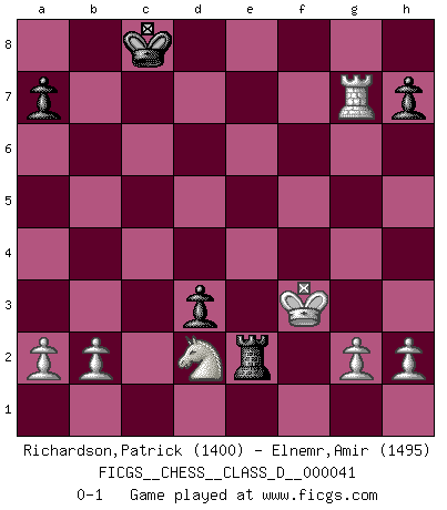 Last move : 0-1 2007 May 23 16:20:32 [Event "FICGS__CHESS__CLASS_D__000041"] [Site "FICGS"] [Date "2007.04.09"] [Round "1"] [White "Richardson,Patrick"] [Black "Elnemr,Amir"] [Result "0-1"] [WhiteElo "1400"] [BlackElo "1495"] 1.e4 e5 2.Nf3 Nc6 3.d4 exd4 4.Bc4 Nf6 5.e5 Ne4 6.O-O d5 7.Bb5 Bd7 8.Nxd4 Nxd4 9.Bxd7+ Qxd7 10.Qxd4 Bc5 11.Qd3 Qf5 12.Be3 b6 13.Bxc5 bxc5 14.f3 Qxe5 15.fxe4 dxe4 16.Qc3 Qd4+ 17.Qxd4 cxd4 18.Rf4 f5 19.Rxf5 O-O-O 20.Nd2 e3 21.Nb3 Rhe8 22.Rf7 e2 23.Re1 Rd5 24.Kf2 c5 25.Rxe2 Rxe2+ 26.Kxe2 c4 27.Nd2 Re5+ 28.Kf3 d3 29.cxd3 cxd3 30.Rxg7 Re2 0-1 Scotch gambit : Dubois-Reti defense Kingside Castling by player White (move 6) Queenside Castling by player Black (move 19) Player Black won this chess game. Follow this game move after move (download)You know you're going to lose. Even when I was ahead I knew I was going to lose. - On playing against Fischer. (Andrew Soltis) Schach ist ein Teil der Kultur, und wenn es mit der Kultur abwärts geht, geht es auch mit dem Schach abwärts. (Mikhail Moiseyevich Botvinik) Si el Ajedrez es una ciencia, es la mas inexacta. Si el Ajedrez es un arte, es demasiado inexacto para ser visto como tal. Si el Ajedrez es un deporte, es demasiado esotérico. Si el Ajedrez es un juego, es demasiado exigente para ser solo un juego. Si el Ajedrez es una aventura, es una muy demandante. Si el Ajedrez es una pasión, es una muy gratificante. Si el Ajedrez es la vida, es una muy triste. (Anónimo) Que feriez-vous si vous étiez en train de jouer aux échecs et que la fin du monde arrive ? Je continuerais à jouer. (Saint Borromée) Think like a man of action, act like a man of thought. (Henri Louis Bergson)