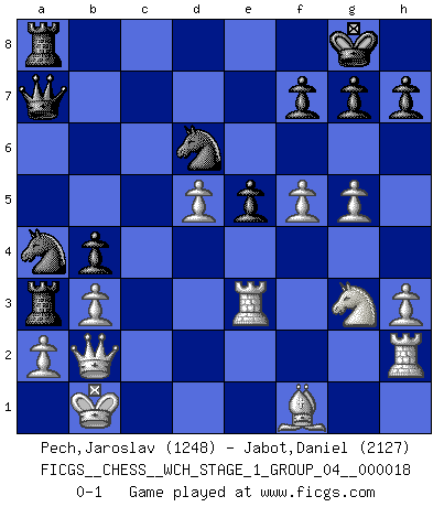 Last move : 0-1 2017 September 23 23:23:39 [Event "FICGS__CHESS__WCH_STAGE_1_GROUP_04__000018"] [Site "FICGS"] [Date "2017.07.01"] [Round "1"] [White "Pech,Jaroslav"] [Black "Jabot,Daniel"] [Result "0-1"] [WhiteElo "1248"] [BlackElo "2127"] 1.e4 c5 2.Nf3 d6 3.d4 cxd4 4.Nxd4 Nf6 5.Nc3 a6 6.Be3 e5 7.Nb3 Be6 8.f3 Be7 9.Qd2 O-O 10.O-O-O Nbd7 11.g4 b5 12.g5 b4 13.Ne2 Ne8 14.f4 a5 15.f5 Bxb3 16.cxb3 a4 17.bxa4 Rxa4 18.b3 Ra5 19.Ng3 d5 20.exd5 Qa8 21.Kb1 Bc5 22.Re1 Nd6 23.Bxc5 Nxc5 24.Re3 Qa7 25.h3 Ra8 26.Rh2 Ra3 27.Qb2 Na4 0-1 Sicilian : Najdorf, Byrne (English) attack Kingside Castling by player Black (move 9) Queenside Castling by player White (move 10) Player Black won this chess game. Follow this game move after move (download)You need not play well - just help your opponent to play badly. (Genrikh Chepukaitis) Die FIDE ist dabei in die Hände der russischen Mafia zu fallen. (Larry Evans) Por la belleza de sus partidas, la claridad de su juego y lo brillante de sus ideas, Fischer se creó el mismo como un artista de la misma estatura como Brahms, Rembrandt y Shakespeare. (David Levy) Ce n'est pas pour s'amuser qu'il joue aux échecs : il célèbre un culte. (Vladimir Nabokov) You can only get smarter by playing a smarter opponent. (Revolver, movie)