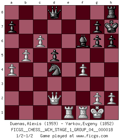Last move : 1/2-1/2 2017 August 11 14:6:24 [Event "FICGS__CHESS__WCH_STAGE_1_GROUP_04__000018"] [Site "FICGS"] [Date "2017.07.01"] [Round "1"] [White "Duenas,Alexis"] [Black "Yarkov,Evgeny"] [Result "1/2-1/2"] [WhiteElo "1959"] [BlackElo "1852"] 1.d4 d5 2.c4 c6 3.e3 Nf6 4.Nc3 Bf5 5.Qb3 Qb6 6.c5 Qc7 7.Nf3 Nbd7 8.Nh4 Bg6 9.Qa4 e5 10.Be2 exd4 11.exd4 b5 12.Bxb5 cxb5 13.Nxb5 Qb8 14.Qa5 Be7 15.Nc7+ Kf8 16.Nxa8 Qxa8 17.Bg5 Nb8 18.O-O Nc6 19.Qd2 Qc8 20.Rae1 Bd8 21.f3 h6 22.Nxg6+ fxg6 23.Bxf6 Bxf6 24.b4 Kg8 25.b5 Nxd4 26.c6 Kh7 27.a4 Qd8 28.f4 1/2-1/2 QGD Slav defense Kingside Castling by player White (move 18) This chess game ended in a draw. Follow this game move after move (download)Chess is a terrible game. If you have no center, your opponent has a freer position. If you do have a center, then you really have something to worry about ! (Siegbert Tarrasch) Die Idee von Capablanca, Schach als Fach in den Schulen zu lehren, ist großartig. (Fidel Castro) Cuando veas una buena jugada, trata de encontrar otra mejor. (Emanuel Lasker) Vous n'êtes pas toujours obligé de jouer le meilleur coup. Un coup doit être actif, entreprenant, correct et beau ! (David Bronstein) All men can see these tactics whereby I conquer, but what none can see is the strategy out of which victory is evolved. (Sun Tzu)