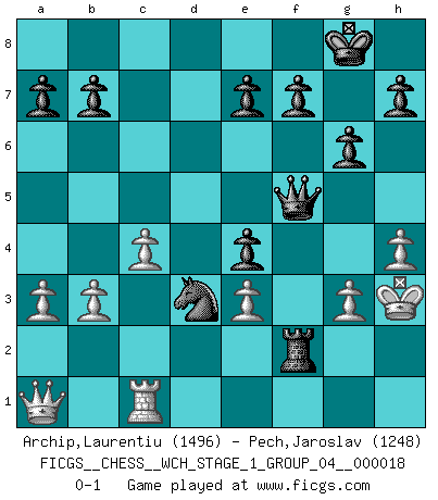 Last move : 0-1 2017 September 18 20:59:48 [Event "FICGS__CHESS__WCH_STAGE_1_GROUP_04__000018"] [Site "FICGS"] [Date "2017.07.01"] [Round "1"] [White "Archip,Laurentiu"] [Black "Pech,Jaroslav"] [Result "0-1"] [WhiteElo "1496"] [BlackElo "1248"] 1.d4 Nf6 2.Nf3 g6 3.g3 Bg7 4.Bg2 O-O 5.O-O d5 6.b3 Ne4 7.Bb2 c5 8.Nbd2 Qa5 9.Nxe4 dxe4 10.Ne5 cxd4 11.Bxd4 Bxe5 12.Bxe5 Qxe5 13.e3 Nc6 14.c4 Rd8 15.Qc2 Bf5 16.Rfd1 Bg4 17.Rxd8+ Rxd8 18.Rc1 Bf3 19.h4 Nb4 20.Qb1 Bxg2 21.Kxg2 Rd2 22.a3 Nd3 23.Qa1 Rxf2+ 24.Kh3 Qf5+ 0-1 King's Indian : Fianchetto without c4 Kingside Castling by player Black (move 4) Kingside Castling by player White (move 5) Player Black won this chess game. Follow this game move after move (download)It is the aim of the modern school, not to treat every position according to one general law, but according to the principle inherent in the position. (Richard Reti) Ich rechne überhaupt nicht voraus. Ich gewinne auch so. (Robert James Fischer) Por la belleza de sus partidas, la claridad de su juego y lo brillante de sus ideas, Fischer se creó el mismo como un artista de la misma estatura como Brahms, Rembrandt y Shakespeare. (David Levy) Un footballeur joue avec ses pieds, parfois avec sa tête. Un joueur d'échecs ne joue qu'avec sa tête. Et quand il ne joue plus, il meurt. (Jacob Murray) The ultimate in disposing one's troops is to be without ascertainable shape. Then the most penetrating spies cannot pry in nor can the wise lay plans against you. (Sun Tzu)