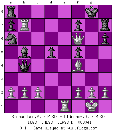 Last move : 0-1 2007 May 27 16:0:55 [Event "FICGS__CHESS__CLASS_D__000041"] [Site "FICGS"] [Date "2007.04.09"] [Round "1"] [White "Richardson,Patrick"] [Black "Oldenhof,Dwight"] [Result "0-1"] [WhiteElo "1400"] [BlackElo "1400"] 1.e4 e5 2.Nf3 d6 3.d4 exd4 4.Nxd4 h6 5.Nc3 Nf6 6.Bc4 c6 7.O-O d5 8.exd5 Nxd5 9.Nxd5 cxd5 10.Bb5+ Bd7 11.Re1+ Be7 12.Nf5 Bxb5 13.Rxe7+ Kf8 14.Bf4 g6 15.Bd6 Kg8 16.Qd4 gxf5 17.Qf6 Rh7 18.Rae1 Na6 19.Bf4 Qf8 20.Rxb7 Qb4 0-1 Philidor : Exchange variation Kingside Castling by player White (move 7) Player Black won this chess game. Follow this game move after move (download)An attack on the wing should be met by play in the center. (Nimzovitch) Frage: Wie viele Autos haben Sie schon zerstört? - Antwort: Nur zwei. (Loek van Wely) Muchos jugadores de Ajedrez se sorprendían cuando después de la partida, Fischer explicaba con calma: 'Yo ya había analizado esta posibilidad' en una posición en la cual yo creía que no era posible de prever desde la apertura. (Mikhail Tal) Les Echecs sont affaire de jugement sensible. Savoir quand frapper et quand esquiver. (Fischer) There is far too much law for those who can afford it and far too little for those who cannot. (Derek Bok)