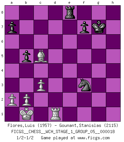 Last move : 1/2-1/2 2017 July 13 23:29:2 [Event "FICGS__CHESS__WCH_STAGE_1_GROUP_05__000018"] [Site "FICGS"] [Date "2017.07.01"] [Round "1"] [White "Flores,Luis"] [Black "Gounant,Stanislas"] [Result "1/2-1/2"] [WhiteElo "1957"] [BlackElo "2115"] 1.e4 c5 2.Nf3 d6 3.d4 cxd4 4.Nxd4 Nf6 5.Nc3 g6 6.Be3 Bg7 7.f3 O-O 8.Qd2 Nc6 9.Bc4 Bd7 10.O-O-O Rc8 11.Bb3 Ne5 12.h4 h5 13.Bg5 Rc5 14.Kb1 b5 15.g4 hxg4 16.h5 Nxh5 17.Nd5 Re8 18.Rxh5 gxh5 19.Qh2 Rxd5 20.Bxd5 Qb6 21.Nf5 Bxf5 22.exf5 Qc5 23.Qxh5 Rc8 24.c3 gxf3 25.Bxe7 f2 26.f6 Qxd5 27.Rxd5 f1Q+ 28.Rd1 Qf3 29.Qxf3 Nxf3 30.fxg7 Kxg7 31.Bxd6 Re8 32.Bc5 1/2-1/2 Sicilian : Dragon, Yugoslav attack, 7...O-O Kingside Castling by player Black (move 7) Queenside Castling by player White (move 10) Promotion Queen by player Black (move 27) This chess game ended in a draw. Follow this game move after move (download)Fischer is the strongest player in the world. In fact, the strongest player who ever lived. (Larry Evans) Wenn sie aufgeben, dann danke ich Ihnen für das Spiel (Eventualzug beim Fernschach). (Anonymous) Diferente gente reacciona diferentemente en aceptar la derrota. (Bobby Fischer) Vouloir jouer aux échecs contre soi-même est aussi paradoxal que vouloir marcher sur son ombre. (Stefan Zweig) A government big enough to give you everything you want is strong enough to take everything you have. (Thomas Jefferson)