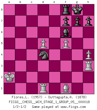 Last move : 1/2-1/2 2017 September 16 19:39:31 [Event "FICGS__CHESS__WCH_STAGE_1_GROUP_05__000018"] [Site "FICGS"] [Date "2017.07.01"] [Round "1"] [White "Flores,Luis"] [Black "Duttagupta,Aniruddha"] [Result "1/2-1/2"] [WhiteElo "1957"] [BlackElo "1878"] 1.e4 c5 2.Nf3 d6 3.d4 cxd4 4.Nxd4 Nf6 5.Nc3 a6 6.Be3 e5 7.Nb3 Be6 8.f3 Be7 9.Qd2 O-O 10.O-O-O Nbd7 11.g4 b5 12.g5 b4 13.Ne2 Ne8 14.f4 a5 15.f5 a4 16.Nbd4 exd4 17.Nxd4 b3 18.Kb1 bxc2+ 19.Nxc2 Bb3 20.axb3 axb3 21.Na3 Ne5 22.h4 Ra4 23.Rh3 Qa8 24.Qd5 Rxa3 25.bxa3 Qxa3 26.Qd2 Nf6 27.gxf6 Bxf6 28.Bd4 Nf3 29.Qb2 Qa2+ 30.Qxa2 bxa2+ 31.Ka1 Nxd4 32.Kxa2 d5 33.exd5 1/2-1/2 Sicilian : Najdorf, Byrne (English) attack Kingside Castling by player Black (move 9) Queenside Castling by player White (move 10) This chess game ended in a draw. Follow this game move after move (download)Bobby is the finest Chess player this country ever produced. His memory for the moves, his brilliance in dreaming up combinations, and his fierce determination to win are uncanny. (John Collins) Ein Schachspiel besteht aus drei Phasen: Die erste, wenn du hofftst den Vorteil zu haben, die zweite, wenn du glaubst einen Vorteil zu haben, und die dritte.... wenn du weißt Du wirst verlieren. (Savielly Grigorievitsch Tartakower) Solo puedes ser bueno en el Ajedrez si amas al juego. (Bobby Fischer) On peut tirer plus d'utilité d'une partie perdue que de 100 parties gagnées. (Capablanca) They misunderestimated me. (George W. Bush, Bentonville nov. 6, 2000)