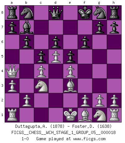 Last move : 1-0 2017 August 14 0:27:24 [Event "FICGS__CHESS__WCH_STAGE_1_GROUP_05__000018"] [Site "FICGS"] [Date "2017.07.01"] [Round "1"] [White "Duttagupta,Aniruddha"] [Black "Foster,Duncan"] [Result "1-0"] [WhiteElo "1878"] [BlackElo "1638"] 1.c4 b6 2.d4 Bb7 3.Nc3 e6 4.a3 c5 5.d5 Be7 6.Bf4 d6 7.e4 e5 8.Be3 Bg5 9.Qa4+ Kf8 10.Bxg5 f6 11.Be3 1-0 English Opening Player White won this chess game. Follow this game move after move (download)Fischer Chess play was always razor-sharp, rational and brilliant. One of the best ever. (Dave Regis) Ich verachte die Medien. (Robert James Fischer) El jugador de combinación piensa hacia adelante; comienza de la posición dada y trabaja las movidas contundentes en su mente. (Emanuel Lasker) Pour se monter efficace, un Cavalier a besoin d'avant-postes ! Les Cavaliers font les meilleurs bloqueurs de pions passés. Fame, I have already. Now I need the money. (an elderly Steinitz)
