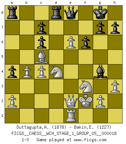 Last move : 1-0 2017 September 15 15:25:6 [Event "FICGS__CHESS__WCH_STAGE_1_GROUP_05__000018"] [Site "FICGS"] [Date "2017.07.01"] [Round "1"] [White "Duttagupta,Aniruddha"] [Black "Bakin,Eugeniy"] [Result "1-0"] [WhiteElo "1878"] [BlackElo "1227"] 1.e4 e5 2.Nf3 Nc6 3.Bc4 Nf6 4.d4 Nxe4 5.dxe5 d5 6.Bxd5 Bf5 7.O-O Bc5 8.Bxc6+ bxc6 9.Nbd2 Nxf2 10.Rxf2 Bxf2+ 11.Kxf2 O-O 12.b3 Qd5 13.Bb2 Qc5+ 14.Bd4 Qd5 15.c4 Qe6 16.Qe2 a5 17.Bc5 Rfd8 18.Nd4 Qd7 19.Re1 Bg4 20.N2f3 a4 21.b4 f6 22.e6 Qe8 23.h3 1-0 Two knights defense Kingside Castling by player White (move 7) Kingside Castling by player Black (move 11) Player White won this chess game. Follow this game move after move (download)I don't believe in psychology. I believe in good moves. (Bobby Fischer) Schachspieler können ausgezeichnet Varianten am Schachbrett berechnen, aber nicht im realen Leben. Zu stark ist der Individualismus im Schach ausgeprägt, und für viele ist ein kleiner momentaner persönlicher Vorteil wichtiger als ein weit größerer Vorteil von morgen. (Anatoly Karpov) Yo nunca en mi vida he jugado la Defensa Francesa, que viene siendo la más aburrida de todas las Aperturas. (Wilhelm Steinitz) Les Echecs représentent une sphère d'idées créatrices basée sur la volonté des deux protagonistes. (Smyslov) No man has ever achieved immortality in his own life time. (Unknown)