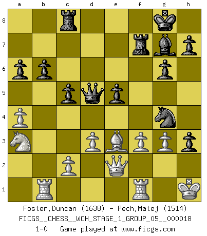 Last move : 1-0 2017 October 10 22:58:19 [Event "FICGS__CHESS__WCH_STAGE_1_GROUP_05__000018"] [Site "FICGS"] [Date "2017.07.01"] [Round "1"] [White "Foster,Duncan"] [Black "Pech,Matej"] [Result "1-0"] [WhiteElo "1638"] [BlackElo "1514"] 1.e4 c5 2.a3 g6 3.b4 Bg7 4.Nc3 d6 5.g3 Nf6 6.Bg2 Nc6 7.Rb1 b6 8.Nge2 Bb7 9.O-O O-O 10.d3 Qd7 11.Be3 Rac8 12.Nb5 Ng4 13.Bh3 f5 14.bxc5 dxc5 15.Bxg4 fxg4 16.Nf4 Ba8 17.h3 gxh3 18.Kh2 Rf7 19.a4 Ne5 20.Qe2 Ng4+ 21.Kh1 a6 22.Na3 e5 23.Nd5 Bxd5 24.exd5 Qxd5+ 25.f3 1-0 This chess game has been lost on time (started : 2017.07.01 22:54:6) Sicilian defense Kingside Castling by player White (move 9) Kingside Castling by player Black (move 9) Player White won this chess game. Follow this game move after move (download)Personally, I rather look forward to a computer program winning the world Chess Championship. Humanity needs a lesson in humility. (Richard Dawkings) Ich habe Putins Aufstieg an die Macht beobachtet und seine Politik, die demokratischen Institutionen meines Landes zu zerstören. (Garry Kasparov) El Peón aislado arroja penumbra sobre todo el tablero. (Aaron Nimzovich) Lorsque vous vous retrouvez devant une position atroce, ne tendez pas un ultime piège dérisoire avec l'intention d'abandonner si l'adversaire le déjoue ! Faites-vous plutôt un devoir de résister comme si votre vie en dépendait. Jouez le coup qui vous déplairait au centuple si vous étiez dans la peau de votre tortionnaire ! The only sure thing about luck is that it will change. (Wilson Mizner)