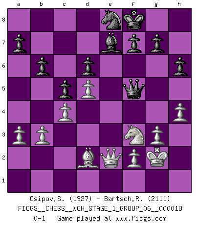 Last move : 0-1 2017 August 30 17:56:53 [Event "FICGS__CHESS__WCH_STAGE_1_GROUP_06__000018"] [Site "FICGS"] [Date "2017.07.01"] [Round "1"] [White "Osipov,Sergey"] [Black "Bartsch,Reinhard Andrea"] [Result "0-1"] [WhiteElo "1927"] [BlackElo "2111"] 1.d4 Nf6 2.c4 e6 3.Nf3 b6 4.g3 Bb7 5.Bg2 Be7 6.O-O O-O 7.Re1 Na6 8.Nc3 Ne4 9.Nxe4 Bxe4 10.Ne5 Bxg2 11.Kxg2 c5 12.d5 Re8 13.e4 Bf6 14.Nf3 d6 15.Rb1 exd5 16.exd5 Rxe1 17.Qxe1 Qd7 18.a3 Re8 19.Qf1 Qf5 20.Bd2 Nc7 21.h4 h6 22.b3 Re7 23.Re1 Ne8 24.Rxe7 Bxe7 25.Qe2 Kf8 0-1 This chess game has been lost on time (started : 2017.07.01 22:54:8) Queen's Indian : Old Main line, 6.O-O Kingside Castling by player White (move 6) Kingside Castling by player Black (move 6) Player Black won this chess game. Follow this game move after move (download)Fischer, who may or may not be mad as a hatter, has every right to be horrified. (Jeremy Silman) Darum geht es im Schach. Einen Tag gibst du deinem Gegner eine Lektion, am nächsten Tag gibt er dir eine. (Robert James Fischer) Fischer sacrificó virtualmente todo lo que la mayoría de nosotros los 'debiles' (término que él usa) valoramos, respetamos y apreciamos por el amor de un astuto, a menudo hermoso tablero de juego, por el privilegio ambivalente de ser su mas grande maestro. (Paul Kollar) Nous sommes les pions de la mystérieuse partie d'Echecs jouée par Dieu. Il nous déplace, nous arrête, nous pousse encore, puis nous lance un à un dans la boîte du Néant. Epitaphe sur la tombe de David Janowsky (1868-1927). Treat your password like your toothbrush. Don't let anybody else use it, and get a new one every six months. (Clifford Stoll)