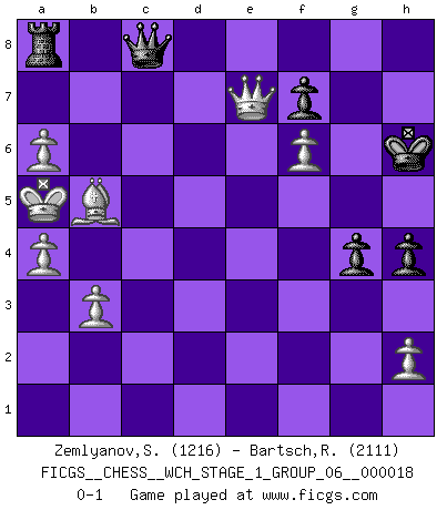Last move : 0-1 2017 November 13 3:32:11 [Event "FICGS__CHESS__WCH_STAGE_1_GROUP_06__000018"] [Site "FICGS"] [Date "2017.07.01"] [Round "1"] [White "Zemlyanov,Sergey"] [Black "Bartsch,Reinhard Andrea"] [Result "0-1"] [WhiteElo "1216"] [BlackElo "2111"] 1.e4 c5 2.Nf3 d6 3.d4 cxd4 4.Nxd4 Nf6 5.Nc3 a6 6.Be3 e5 7.Nb3 Be7 8.f3 Be6 9.Qd2 O-O 10.O-O-O Nbd7 11.g4 b5 12.g5 Nh5 13.Kb1 Qc7 14.Nd5 Bxd5 15.exd5 Nb6 16.Na5 Nxd5 17.Qxd5 Qxa5 18.Bd3 Rac8 19.c4 Qd8 20.cxb5 Bxg5 21.Qe4 g6 22.bxa6 Bxe3 23.Qxe3 Nf4 24.Bb5 Ra8 25.Rd2 Ne6 26.a4 Rc8 27.Rhd1 Nd4 28.Rxd4 exd4 29.Qxd4 d5 30.Qxd5 Qh4 31.Qe5 Rfd8 32.Rd6 Rxd6 33.Qxd6 Rd8 34.Qc7 Qe1+ 35.Ka2 Qe6+ 36.Qc4 Qb6 37.Qc6 Qe3 38.Qe4 Qb6 39.f4 Rc8 40.f5 Rc7 41.Qe5 Ra7 42.Bc4 Qd8 43.f6 h5 44.Qe3 Rc7 45.Qb6 Qc8 46.Bb5 Kh7 47.Qd6 Kh6 48.Ka3 Qb8 49.b3 h4 50.Qf4+ g5 51.Qd6 Qc8 52.Kb4 Ra7 53.Ka5 Ra8 54.Qe7 g4 0-1 This chess game has been lost on time (started : 2017.07.01 22:54:8) Sicilian : Najdorf, Byrne (English) attack Kingside Castling by player Black (move 9) Queenside Castling by player White (move 10) Player Black won this chess game. Follow this game move after move (download)We like to think. (Gary Kasparov) Später, ... hatte ich zunehmend Erfolg in entscheidenden Partien. Vielleicht weil ich eine einfache Wahrheit erkannte: nicht nur ich hatte Angst, auch mein Gegner. (Mikhail Nekhemyevich Tal) El Ajedrez se juega con la mente... ¡no con las manos!. (Renaud y Kahn) Des combinaisons [dans le jeu d'échecs] pareilles à des mélodies. Je crois entendre pour ainsi dire la musique des coups... (Vladimir Nabokov) Industry executives and analysts often mistakenly talk about strategy as if it were some kind of chess match. But in chess, you have just two opponents, each with identical resources, and with luck playing a minimal role. The real world is much more like a poker game, with multiple players trying to make the best of whatever hand fortune has dealt them. In our industry, Bill Gates owns the table until someone proves otherwise. (David Moschella, 'Computerworld')