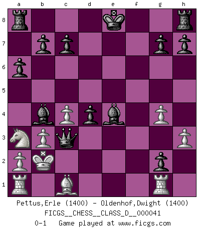 Last move : 0-1 2007 May 27 21:29:58 [Event "FICGS__CHESS__CLASS_D__000041"] [Site "FICGS"] [Date "2007.04.09"] [Round "1"] [White "Pettus,Erle"] [Black "Oldenhof,Dwight"] [Result "0-1"] [WhiteElo "1400"] [BlackElo "1400"] 1.c4 e5 2.Nc3 Nf6 3.g3 d5 4.b3 d4 5.Nb5 a6 6.Na3 Nc6 7.Bg2 Bd7 8.e4 Nb4 9.d3 Nxd3+ 10.Qxd3 Bb4+ 11.Kd1 Ng4 12.h3 Nxf2+ 13.Ke2 Nxd3 14.Kxd3 f5 15.Nf3 Qf6 16.g4 fxe4+ 17.Kxe4 Bc6+ 18.Kd3 e4+ 19.Ke2 exf3+ 20.Kd3 fxg2 21.Rg1 Qf3+ 22.Kc2 Be4+ 23.Kb2 Qc3+ 0-1 English : Bremen, reverse Dragon Player Black won this chess game. Follow this game move after move (download)Modern Chess is too much concerned with things like Pawn structure. Forget it, Checkmate ends the game. (Nigel Short) Wenn Schach ein enormer Dschungel ist, der seine Myriaden von Geheimnissen nicht preisgeben will, dann sind Computer die Kettensägen einer gewaltigen ökologisch unsensiblen Nutzholzfirma. (Nigel Short) El Ajedrez era la lengua materna de Capablanca. (Reti) Seul un grand joueur sait à quel point il joue faiblement. (Xavier Tartacover) There are more things in heaven and earth than practically anywhere else. (Unknown)