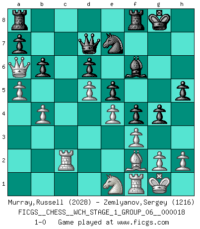 Last move : 1-0 2017 November 14 3:45:2 [Event "FICGS__CHESS__WCH_STAGE_1_GROUP_06__000018"] [Site "FICGS"] [Date "2017.07.01"] [Round "1"] [White "Murray,Russell"] [Black "Zemlyanov,Sergey"] [Result "1-0"] [WhiteElo "2028"] [BlackElo "1216"] 1.d4 Nf6 2.Nf3 g6 3.c4 Bg7 4.Nc3 O-O 5.e4 d6 6.Be2 e5 7.O-O Nc6 8.d5 Ne7 9.Ne1 Nd7 10.Be3 f5 11.f3 f4 12.Bf2 g5 13.Rc1 Ng6 14.c5 Nxc5 15.b4 Na6 16.Nb5 b6 17.Qa4 h5 18.Nxd6 cxd6 19.Bxa6 Bxa6 20.Qxa6 g4 21.Rc6 Ne7 22.Rc2 Qd7 23.a4 Bf6 24.a5 1-0 This chess game has been lost on time (started : 2017.07.01 22:54:8) King's Indian : East Indian defense Kingside Castling by player Black (move 4) Kingside Castling by player White (move 7) Player White won this chess game. Follow this game move after move (download)Chess is a fairy tale of 1001 blunders. (Savielly Tartakower) Wie bekannt hörte Morphy 1859 auf, Schach zu spielen. Seine Enttäuschung galt nicht so sehr dem Schach, wie den Schachspielern. (Robert James Fischer) La pasion por jugar al Ajedrez es una de las mas inexplicables en el mundo. (H.G. Wells) La conception d'un plan est le processus par lequel un joueur exploite les avantages de sa position tout en s'efforçant d'en réduire au minimum les inconvénients. Afin de garantir le succès, un plan doit toujours se fonder sur un diagnostic objectif des particularités d'une position. La conception d'un plan est d'autant plus difficile que la position est équilibrée, et grandement facilitée lorsqu'il n'existe qu'un seul plan susceptible de répondre aux exigences de la position. (Harry Golombek) The question of whether computers can think is just like question of whether submarines can swim. (Edsger W. Dijkstra)