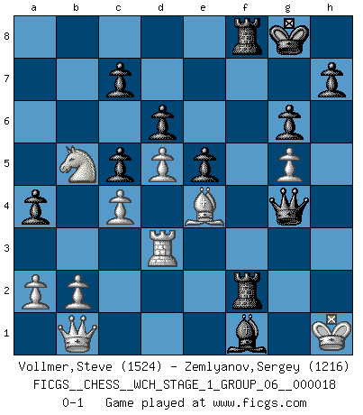 Last move : 0-1 2017 September 30 1:13:52 [Event "FICGS__CHESS__WCH_STAGE_1_GROUP_06__000018"] [Site "FICGS"] [Date "2017.07.01"] [Round "1"] [White "Vollmer,Steve"] [Black "Zemlyanov,Sergey"] [Result "0-1"] [WhiteElo "1524"] [BlackElo "1216"] 1.d4 Nf6 2.c4 g6 3.Nc3 Bg7 4.e4 d6 5.Nf3 O-O 6.Be2 e5 7.d5 a5 8.O-O Na6 9.h3 Nc5 10.Qc2 Nh5 11.Re1 Nf4 12.Bf1 b6 13.Be3 f5 14.Bxc5 bxc5 15.Bd3 a4 16.Rad1 Bh6 17.Kh2 Bd7 18.g3 fxe4 19.Bxe4 Nxh3 20.Kg2 Bg4 21.Rd3 Qd7 22.Rh1 Rf6 23.Nb5 Raf8 24.Rf1 Nf4+ 25.gxf4 Bh3+ 26.Kh1 Bxf1 27.Ng5 Bxg5 28.fxg5 Rxf2 29.Qb1 Qg4 0-1 King's Indian : Petrosian system, Stein variation Kingside Castling by player Black (move 5) Kingside Castling by player White (move 8) Player Black won this chess game. Follow this game move after move (download)Methodical thinking is of more use in Chess than inspiration. (C. J. S. Purdy) Die westlichen Werte sind eine Sprache, welche die Putin-Administration nicht versteht. (Garry Kasparov) a manera como él juega al Ajedrez, demuestra la completa naturaleza de un hombre. (Stanley Ellin) Les échecs sont plus proches de l'art de l'assassinat que de l'art de la guerre. (Arturo Perez-Reverte) Dave, my mind is going. I can feel it. (HAL 9000 in 2001, a space odyssey)