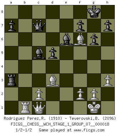 Last move : 1/2-1/2 2017 August 29 18:51:2 [Event "FICGS__CHESS__WCH_STAGE_1_GROUP_07__000018"] [Site "FICGS"] [Date "2017.07.01"] [Round "1"] [White "Rodriguez Perez,Rene"] [Black "Teverovski,Bogoljub"] [Result "1/2-1/2"] [WhiteElo "1910"] [BlackElo "2096"] 1.e4 Nc6 2.Nf3 e5 3.d4 exd4 4.Nxd4 Nf6 5.Nc3 Bb4 6.Nxc6 bxc6 7.Bd3 d5 8.exd5 cxd5 9.O-O O-O 10.Bg5 c6 11.Qf3 Rb8 12.h3 Bd6 13.Rab1 Re8 14.Rfe1 Rxe1+ 15.Rxe1 Be6 16.Ne2 Rxb2 17.Nd4 Rxa2 18.Nxc6 Qb6 19.Bxf6 Qxc6 20.Qh5 g6 21.Qh4 Qc5 22.Rb1 Qc7 23.Qd4 Bc5 24.Qc3 Ra3 25.Qb2 Qb6 26.Qc1 Qc7 1/2-1/2 KP : Nimzovich defense Kingside Castling by player White (move 9) Kingside Castling by player Black (move 9) This chess game ended in a draw. Follow this game move after move (download)On the chessboard, lies and hypocrisy do not survive long. (Emanuel Lasker) Mein Name ist Rustam Kamsky. Sie haben meinen Sohn belästigt. Bereiten Sie sich aufs Sterben vor. (Rustam Kamsky) Nunca antes ha habido un jugador de Ajedrez con tal conocimiento a fondo de las complejidades del juego y una inmensa voluntad absolutamente indomable de ganar. Yo pienso que Fischer es el jugador mas grande que jamás haya existido. (Lisa Lane) En blitz, le Cavalier l'emporte sur le Fou. (Vlastimil Hort) Pushing plastic is for the many, pushing virtual pieces is for the fewer, pushing wood is for the very few. (Normajean Yates)