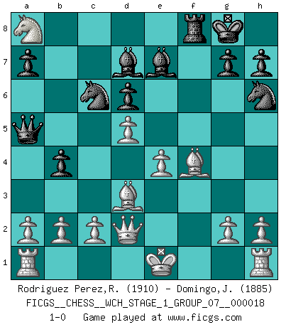 Last move : 1-0 2017 September 27 9:52:16 [Event "FICGS__CHESS__WCH_STAGE_1_GROUP_07__000018"] [Site "FICGS"] [Date "2017.07.01"] [Round "1"] [White "Rodriguez Perez,Rene"] [Black "Domingo,Jordi"] [Result "1-0"] [WhiteElo "1910"] [BlackElo "1885"] 1.e4 e5 2.Nf3 f5 3.Nxe5 Qf6 4.d4 d6 5.Nc4 fxe4 6.Nc3 Qg6 7.f3 Be7 8.fxe4 Nh6 9.Be3 O-O 10.Qd2 Be6 11.Bd3 b5 12.Na5 b4 13.Nb5 Qh5 14.Bf4 Bd7 15.Nxc7 Qxa5 16.Nxa8 Nc6 17.d5 1-0 This chess game has been lost on time (started : 2017.07.01 22:54:10) Latvian counter-gambit Kingside Castling by player Black (move 9) Player White won this chess game. Follow this game move after move (download)There just isn't enough televised Chess. (David Letterman) Die meiste Zeit treffe ich auf Gegner, die meine Enkel sein könnten. Ich bin da, um ihnen zu zeigen, dass sie von mir noch einiges lernen können. (Viktor Kortschnoi) Algunos sacrificios son sólidos, los demás son míos. (Mikhail Tal) D'abord les bases : Jouez et étudiez, puis étudiez et jouez, ensuite jouez et étudiez, puis étudiez et jouez. Deuxièmement : Donnez toujours le meilleur de vous-même ! (Ken Smith) The existence of forgetting has never been proved: We only know that some things don't come to mind when we want them. (Friedrich Nietzsche)