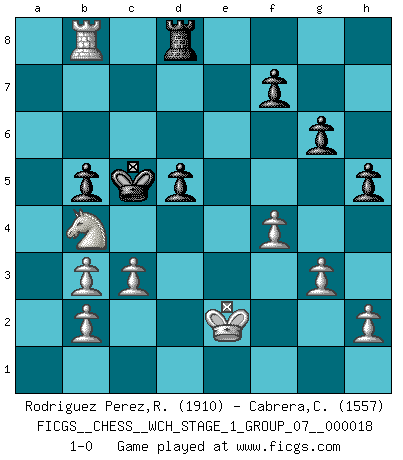 Last move : 1-0 2017 August 15 18:44:3 [Event "FICGS__CHESS__WCH_STAGE_1_GROUP_07__000018"] [Site "FICGS"] [Date "2017.07.01"] [Round "1"] [White "Rodriguez Perez,Rene"] [Black "Cabrera,Claudio"] [Result "1-0"] [WhiteElo "1910"] [BlackElo "1557"] 1.e4 e5 2.f4 d5 3.exd5 e4 4.d3 Nf6 5.dxe4 Nxe4 6.Nf3 Bf5 7.Be3 c6 8.Bc4 b5 9.Bb3 Bb4+ 10.c3 Bc5 11.Bxc5 Nxc5 12.Qe2+ Qe7 13.Nd4 Qxe2+ 14.Kxe2 Bd7 15.Na3 a6 16.Nac2 Nxb3 17.axb3 Ke7 18.Ra5 cxd5 19.Rha1 Rd8 20.Nb4 Kd6 21.Nxb5+ Bxb5+ 22.Rxb5 axb5 23.Rxa8 h5 24.g3 g6 25.Ra5 Kc5 26.Ra7 Rd7 27.Ra8 Rd8 28.Rxb8 1-0 KGD : Falkbeer, 5.de Player White won this chess game. Follow this game move after move (download)The mistakes are there, waiting to be made. (Savielly Tartakower) Nicht daß Diemer aus Opportunismus Mitglied der NSDAP geworden wäre. Er war ein Fanatiker, in allem, was er tat. (Hans Ree) No hay precio que no valga la pena por la cabellera del Rey enemigo. (Koblentz) Les échecs, c'est la lutte contre l'erreur. (Johannes Zukertort) At work, the authority of a person is inversely proportional to the number of pens that person is carrying. (Dan Rotaru)
